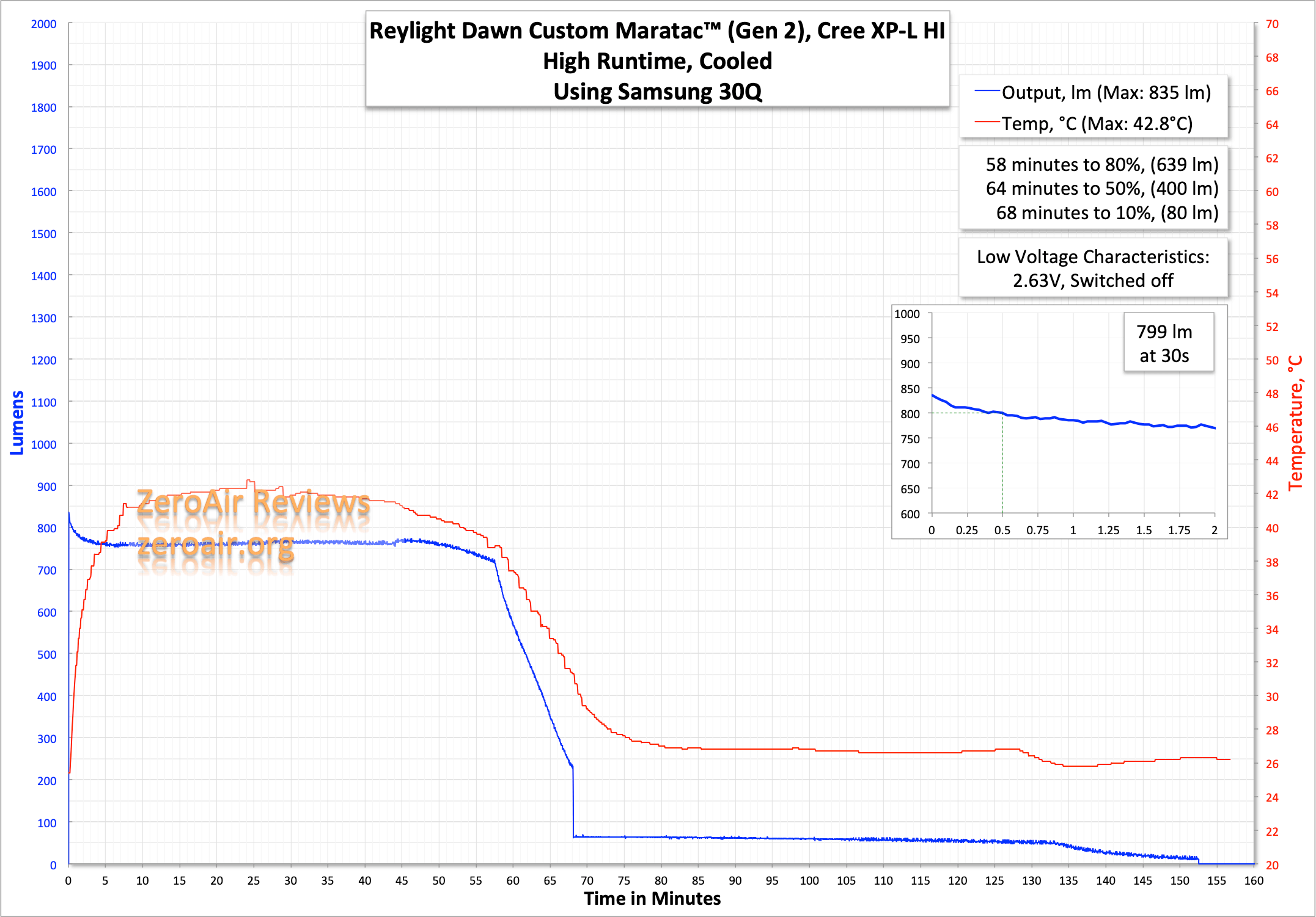 The high output is fairly well regulated, at around 800 lumens.