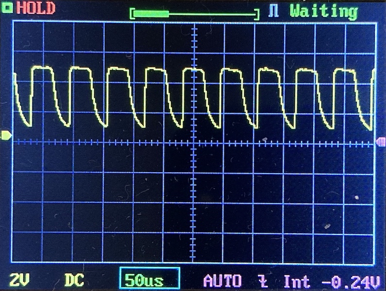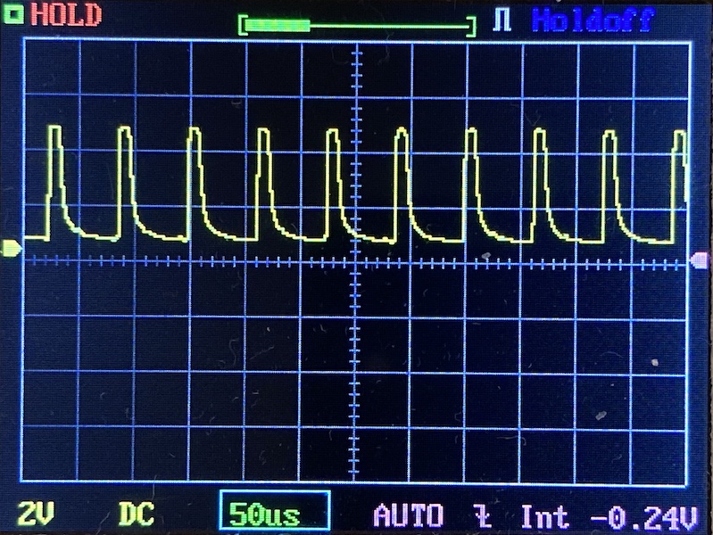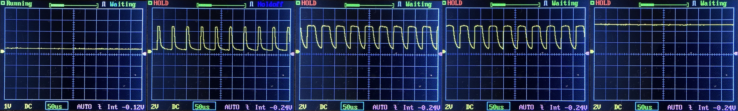 Then there’s the Ultrafire WF-602C flashlight, which has some of the worst PWM I’ve seen. It’s so bad that I used a post about it to explain PWM! Here are multiple timescales (10ms, 5ms, 2ms, 1ms, 0.5ms, 0.2ms) to make comparing this “worst” PWM light to the test light easier. That post also explains why I didn’t test the WF-602C at the usual 50us scale.