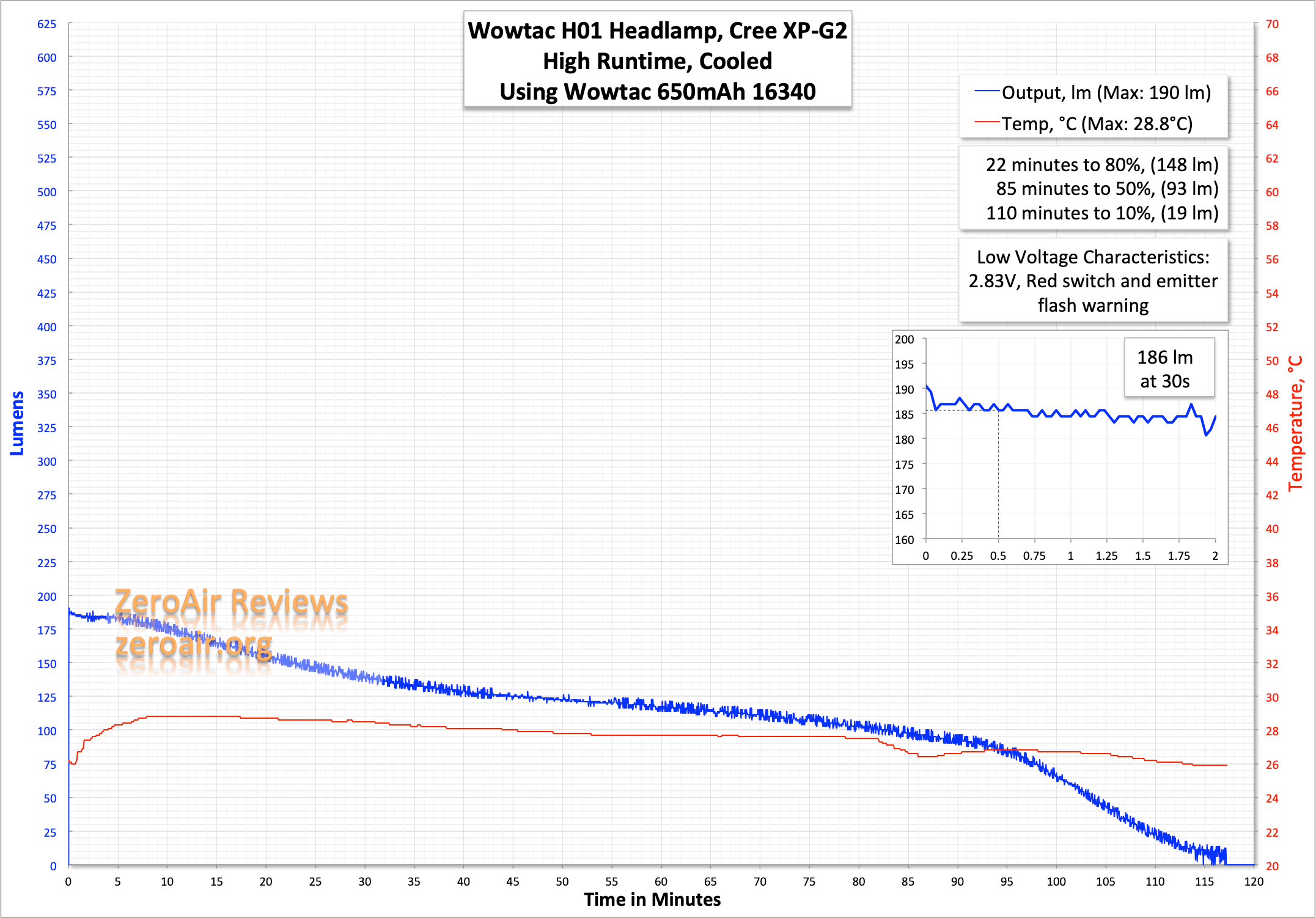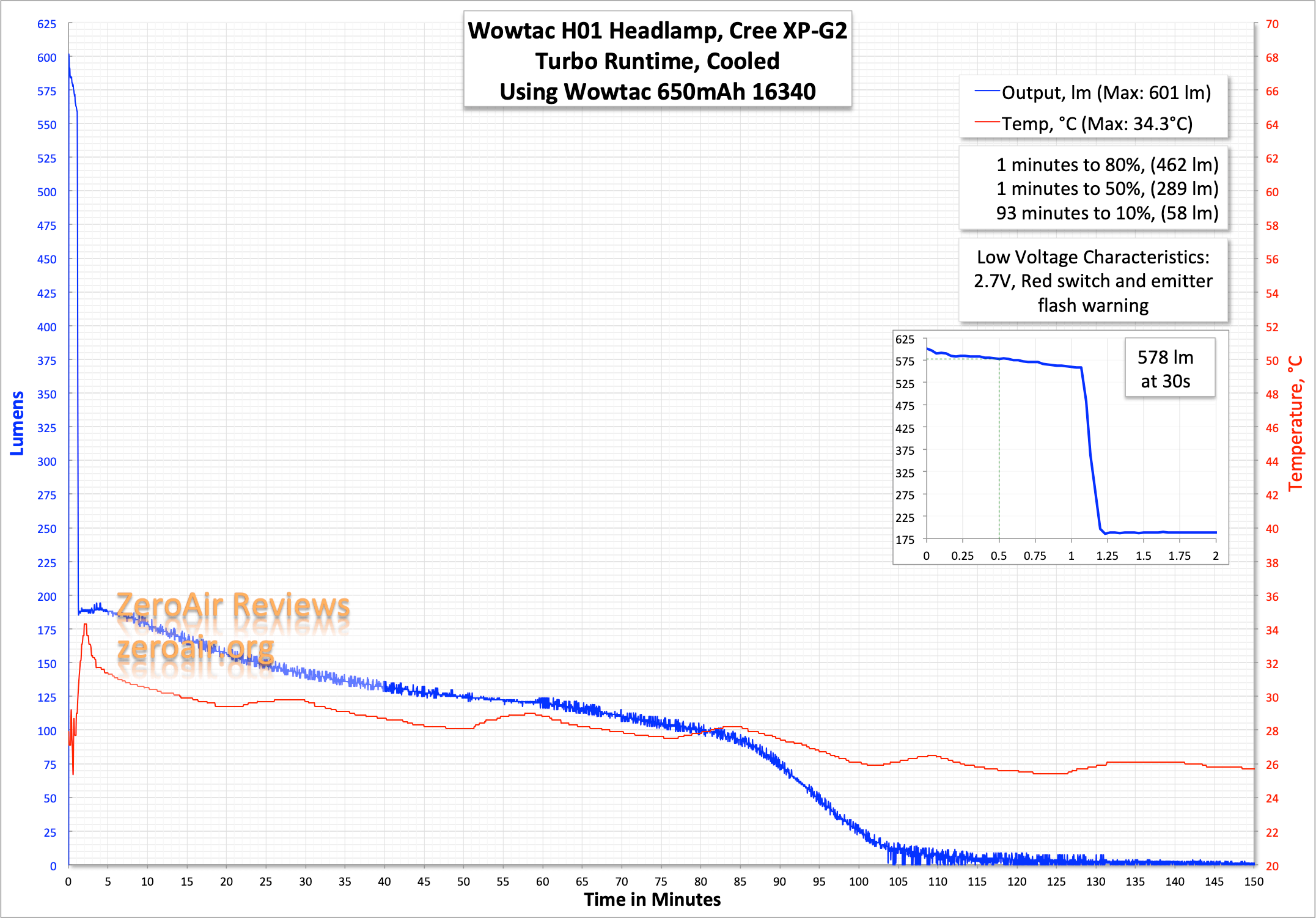 Here are two runtimes. Turbo essentially hits the claim and steps down after around 75 seconds as claimed. Then the output drifts off from “High” toward the low voltage warning. I’d like a little better-regulated output, but I am not really complaining here.