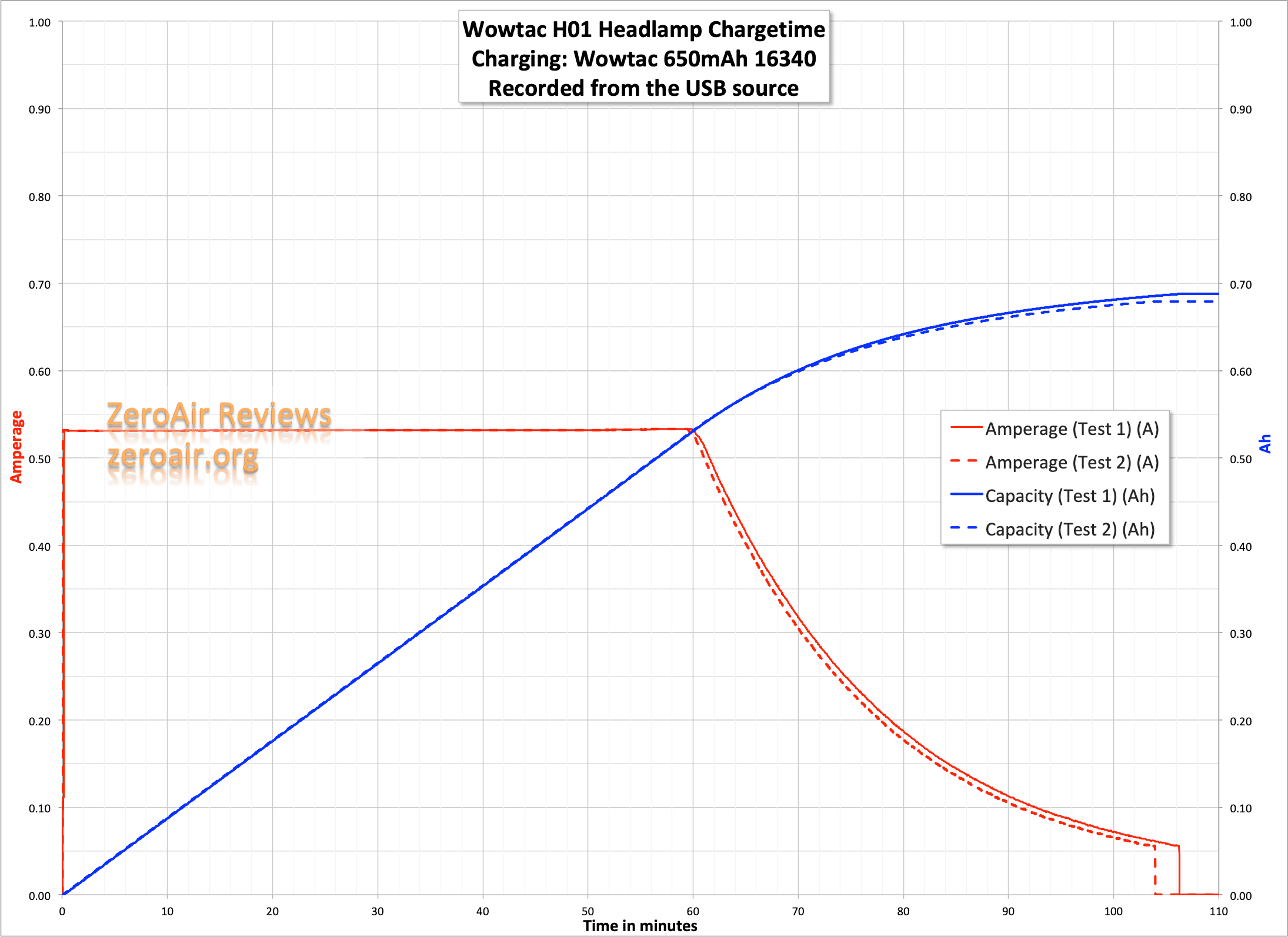 Charging looks great, at just over half an amp, or approximately 1C for the 16340 cell. This is good. When charging, the indicator switch is red. When complete, the switch is blue. If something is wrong, the switch is a mix of red and blue (purpleish, but mostly “red and blue”).