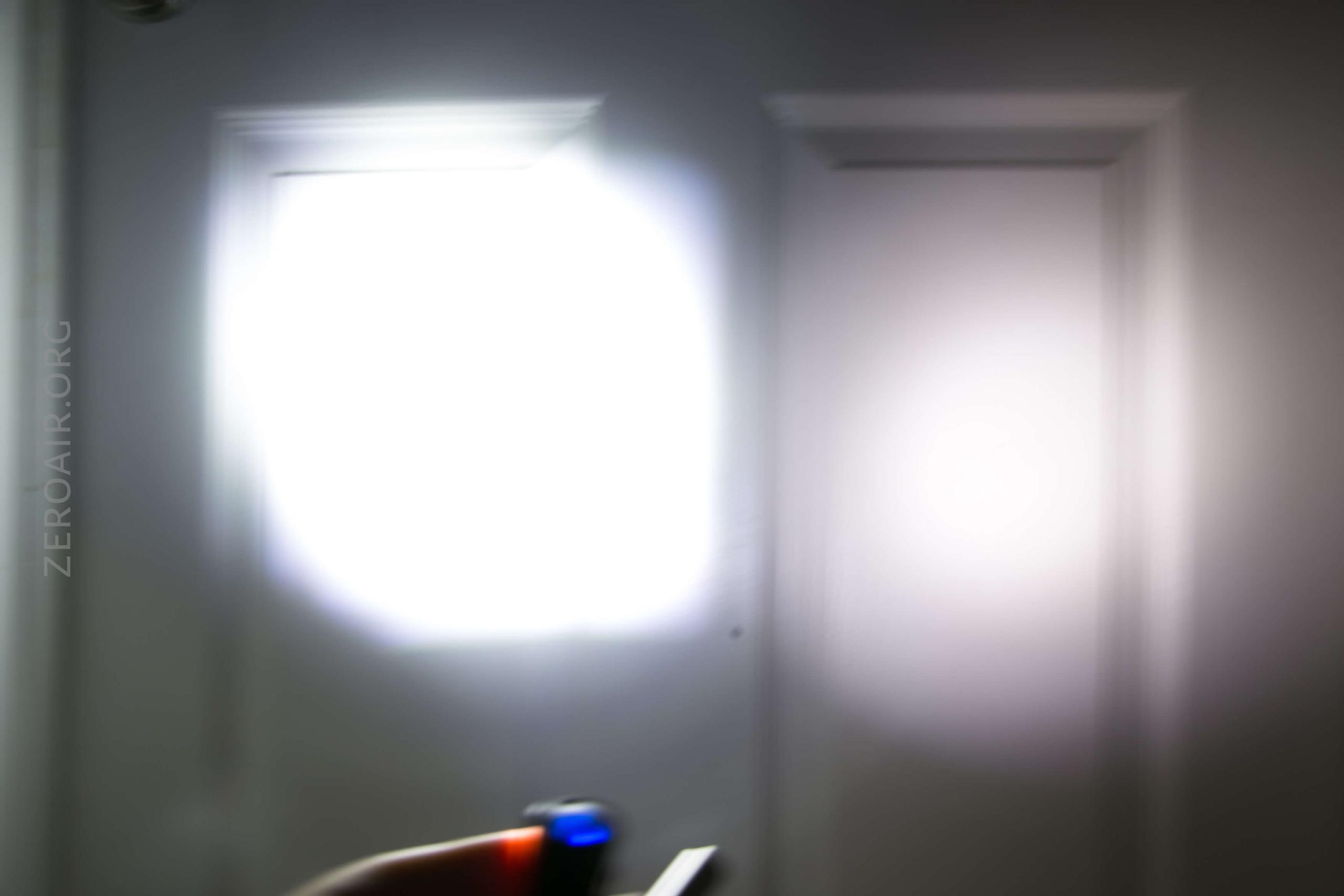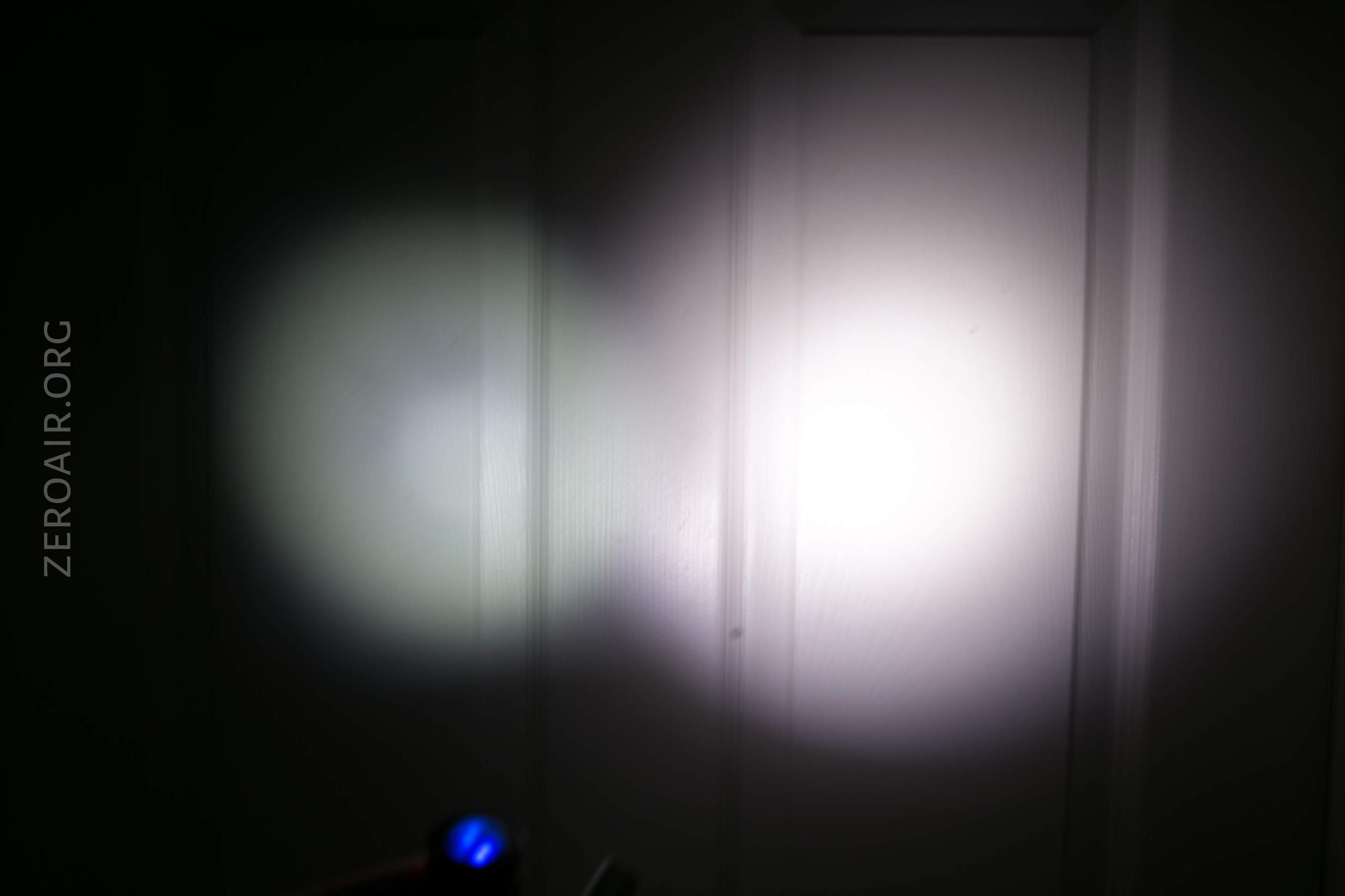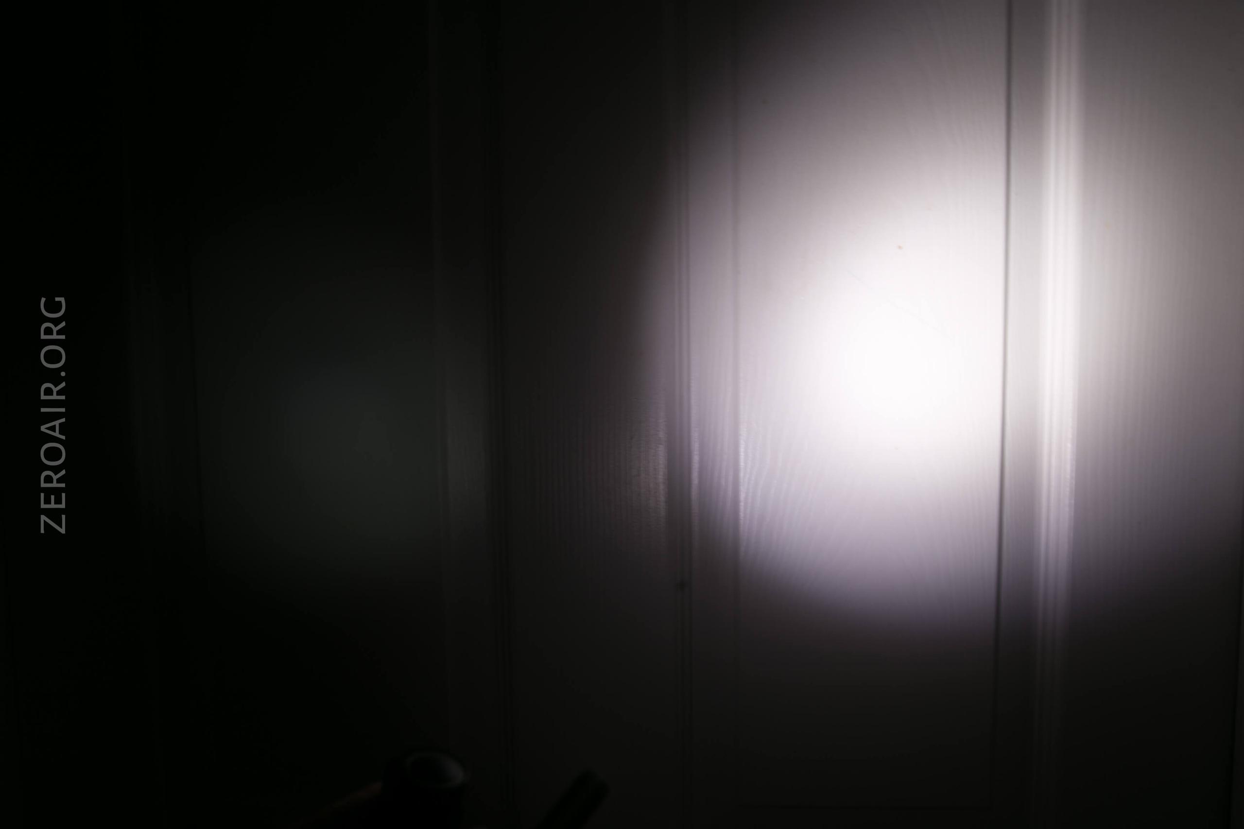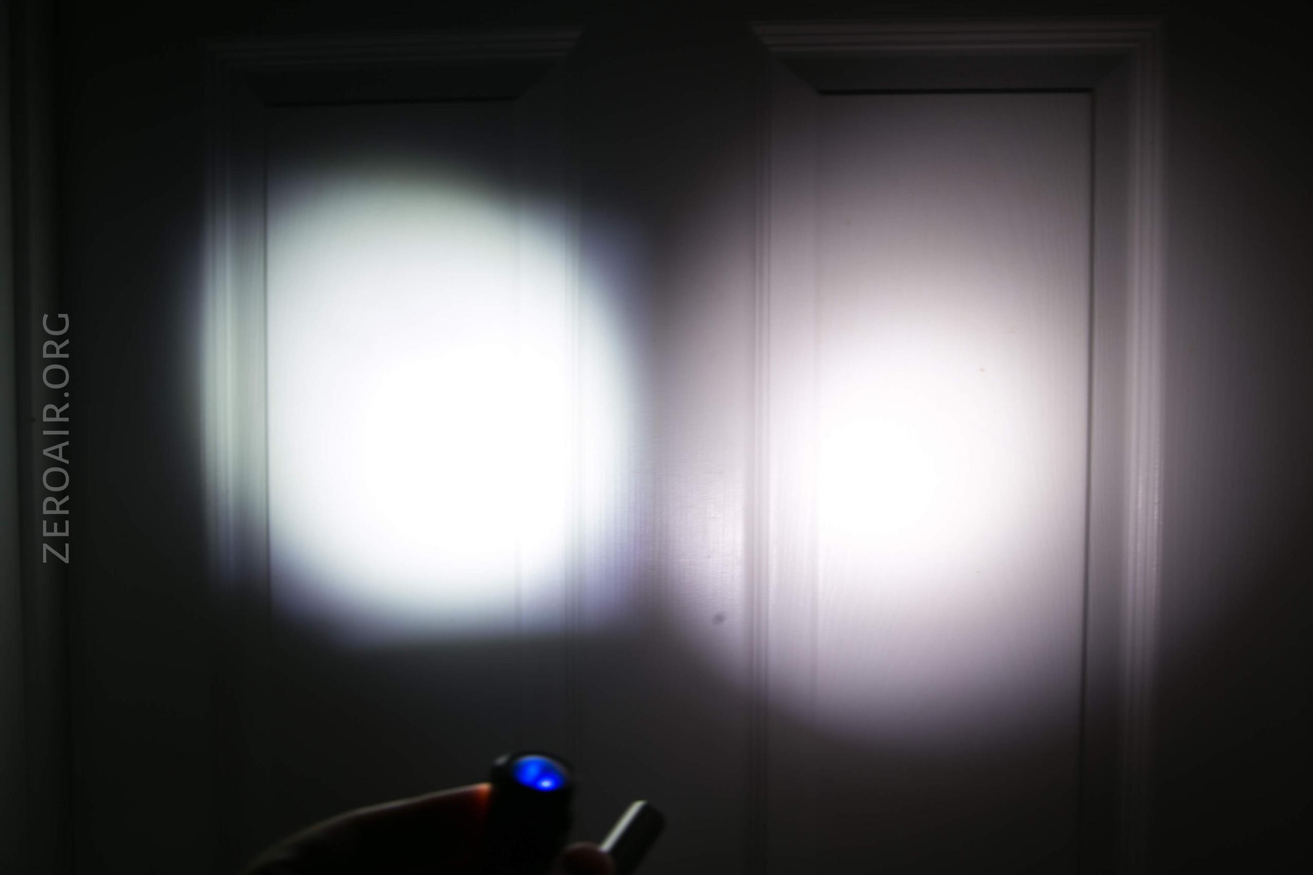 I think it’s possible in my copy that the TIR isn’t seated right – see the images below. The beam profile has a weir corona, is very square-shaped, and also has some square legs off to the top right. In the pics, it’s not all that noticeable, but it’s pretty annoying in person. I have a feeling putting a new emitter in here and making sure the optic is seated right will fix this up.