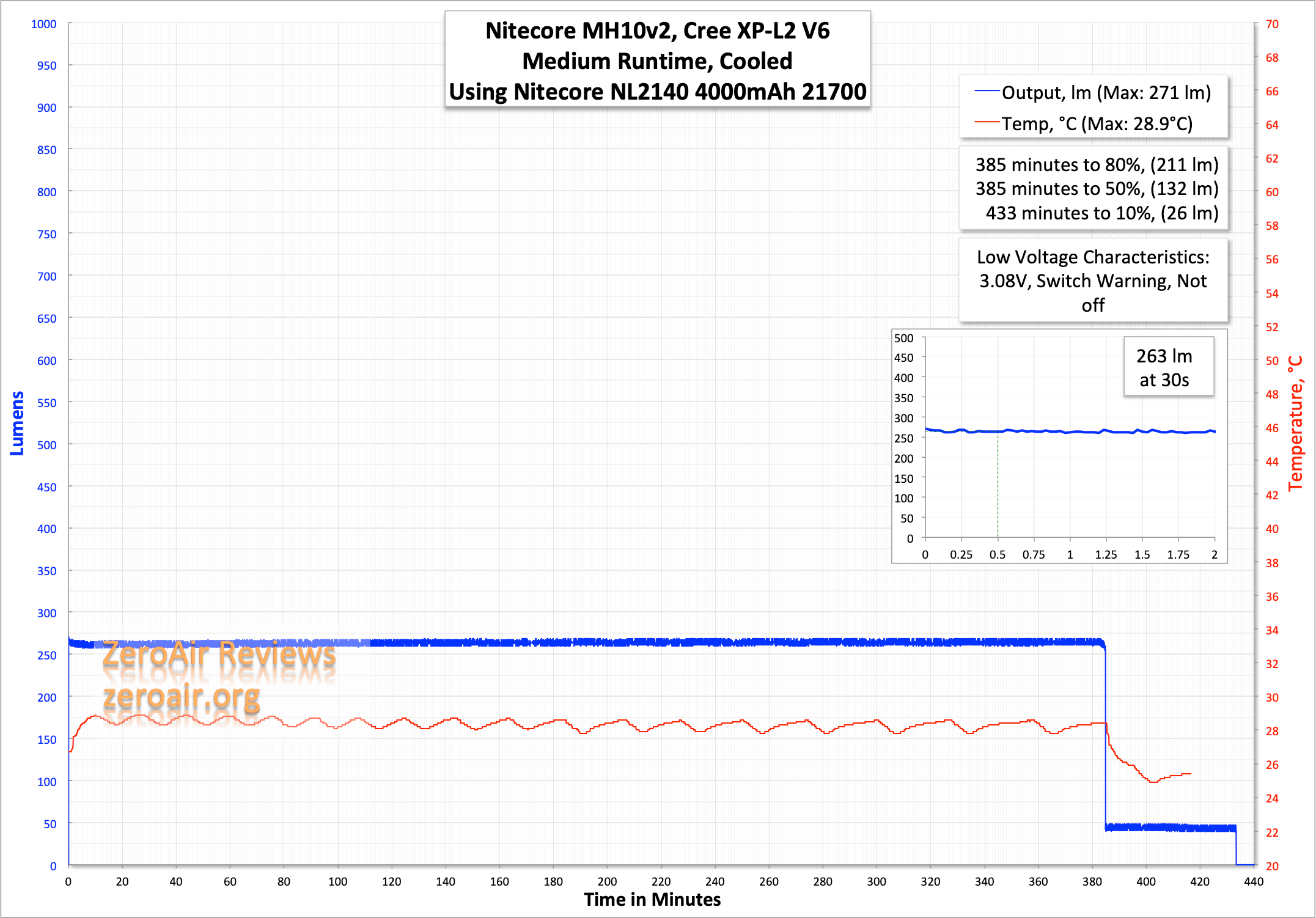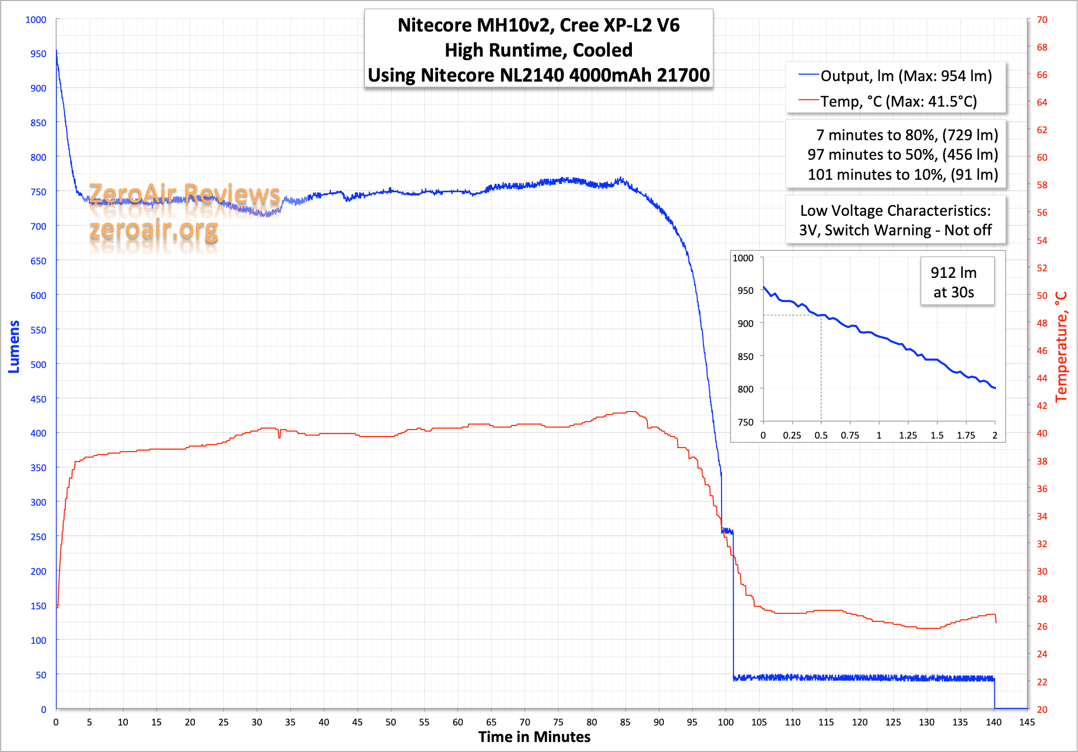Here are two runtimes. You’ll note that the output only hits 912 lumens at 30s, and only 954 max – well short of the 1200 claimed. But remember the bezel, which is crenelated, and know that some light will escape the runtime apparatus. So it measures low, but maybe not that low.