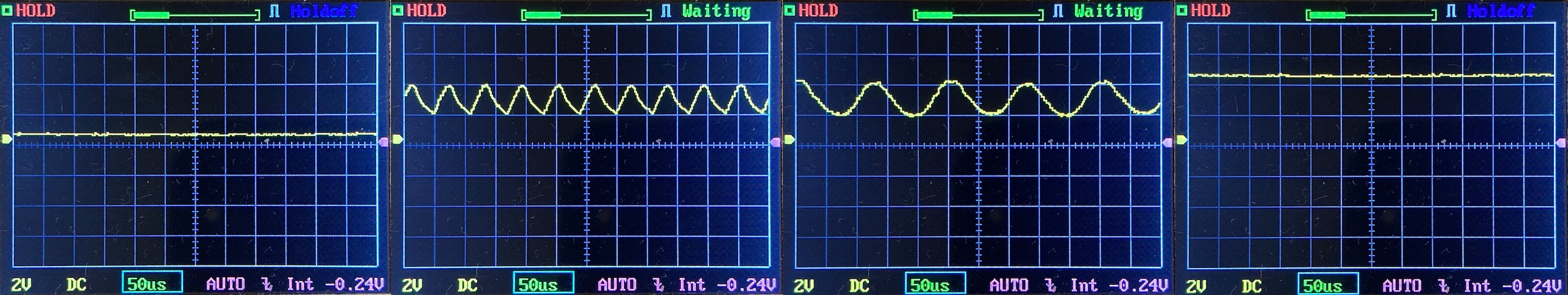 Then there’s the Ultrafire WF-602C flashlight, which has some of the worst PWM I’ve seen. It’s so bad that I used a post about it to explain PWM! Here are multiple timescales (10ms, 5ms, 2ms, 1ms, 0.5ms, 0.2ms) to make comparing this “worst” PWM light to the test light easier. That post also explains why I didn’t test the WF-602C at the usual 50us scale.