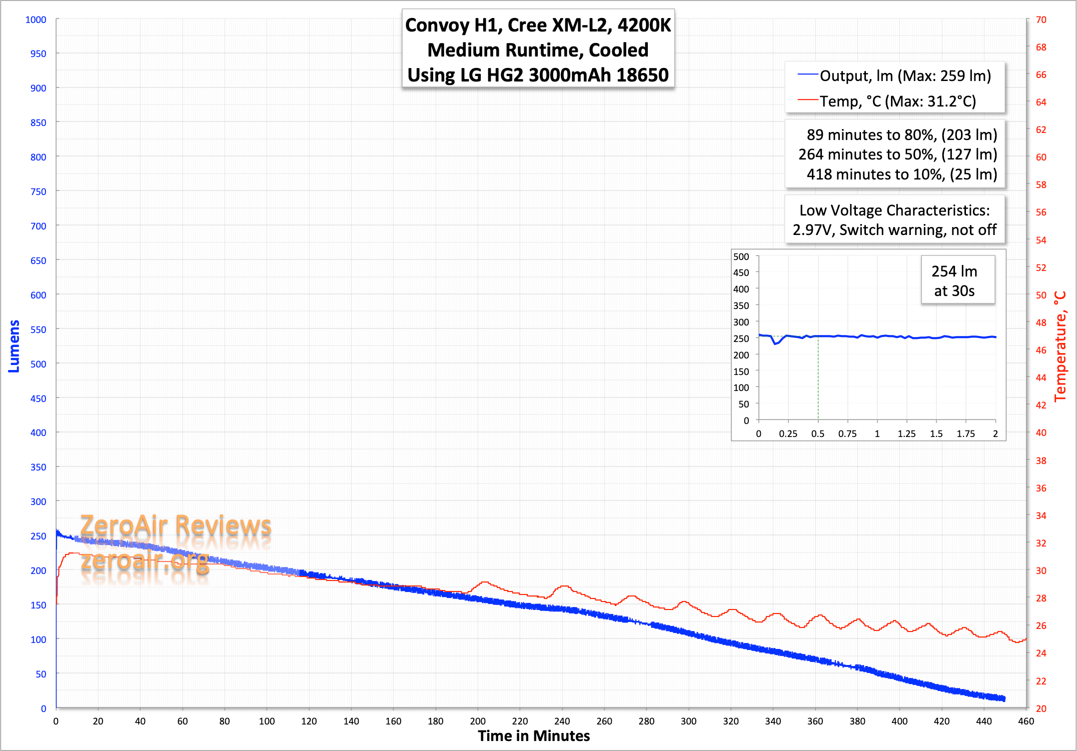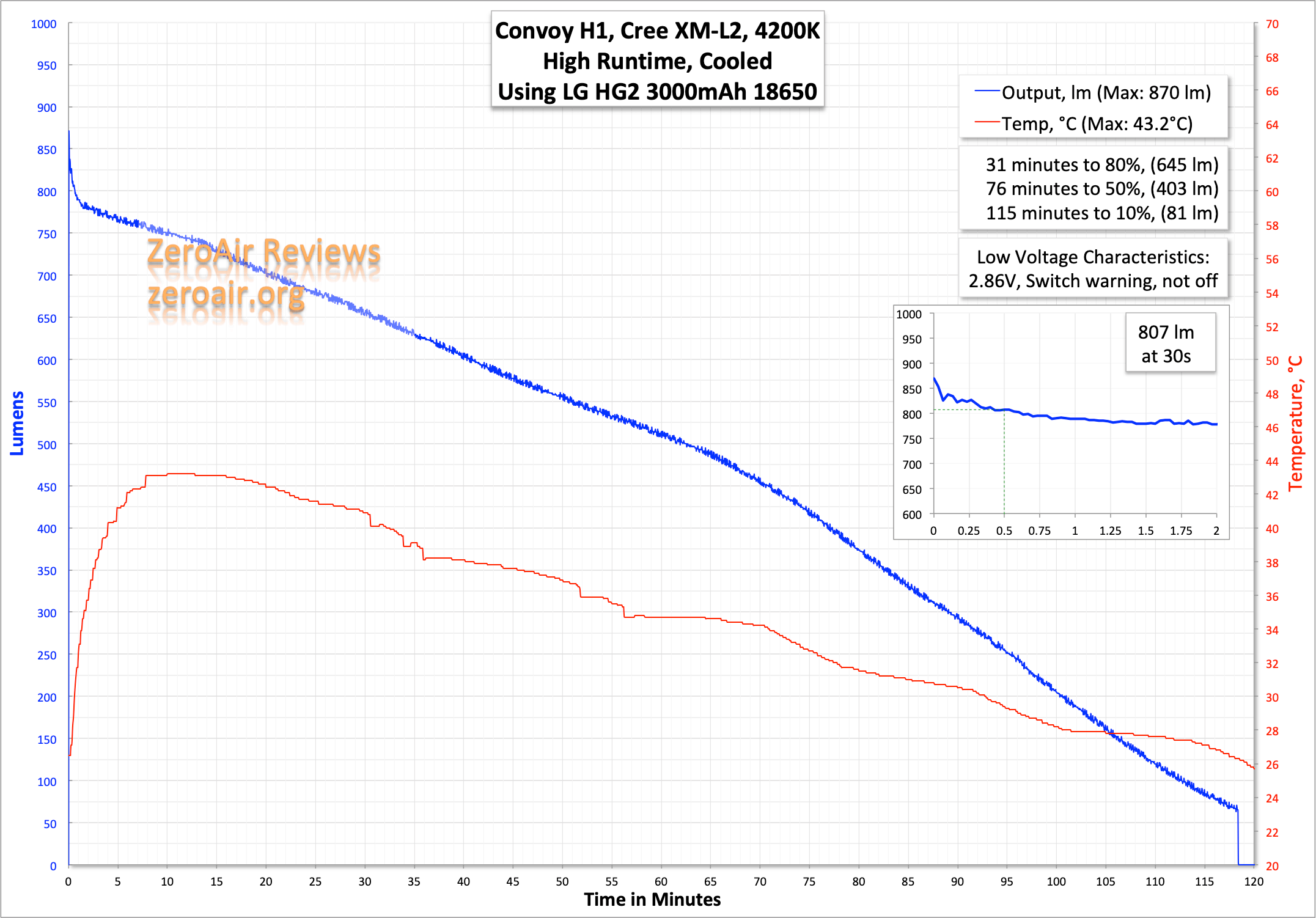 Output on High is (as typical) unregulated and just trails off from the initial output, as cell voltage drops. Also of note is the output at 30s is much below the claim – the actual claim of 1048 lumens is likely for the 6500K color temperature version, which would typically have a higher output than warmer emitters.