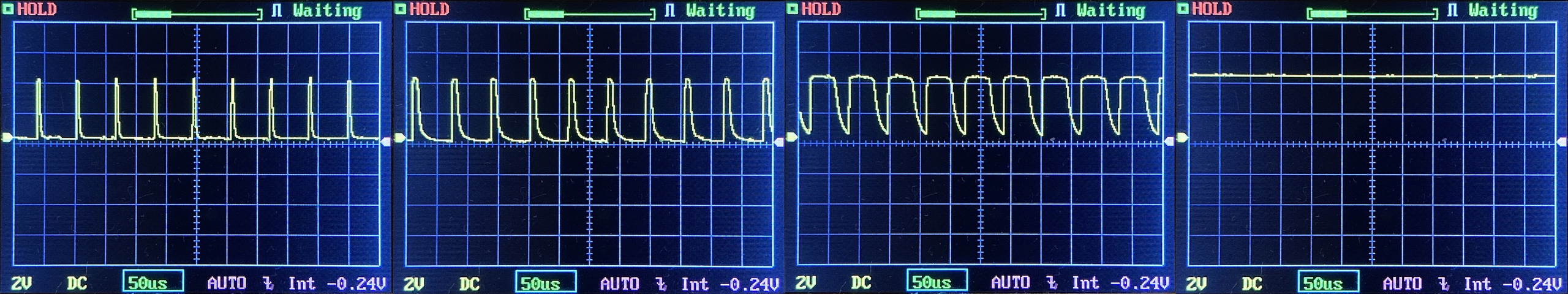 Then there’s the Ultrafire WF-602C flashlight, which has some of the worst PWM I’ve seen. It’s so bad that I used a post about it to explain PWM! Here are multiple timescales (10ms, 5ms, 2ms, 1ms, 0.5ms, 0.2ms) to make comparing this “worst” PWM light to the test light easier. That post also explains why I didn’t test the WF-602C at the usual 50us scale.