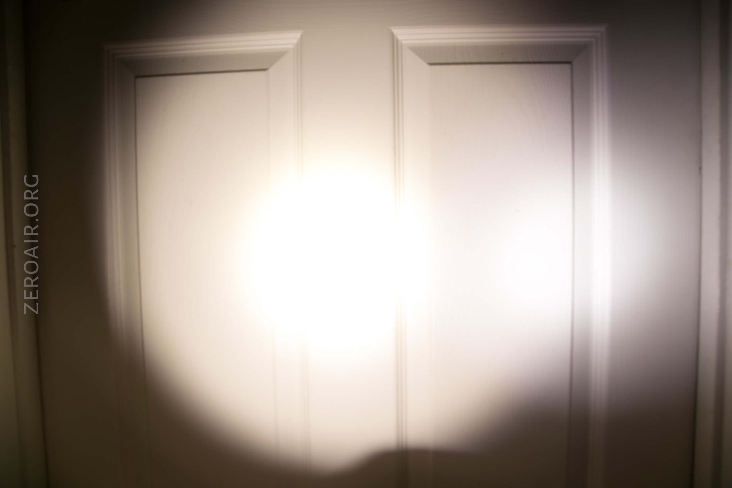 In my review copy is a Convoy XM-L2 in 4200K. It’s a quite warm 4200K I think. The small shallow reflector has a light orange peel. The lens is held in place by a screw-down retaining ring.