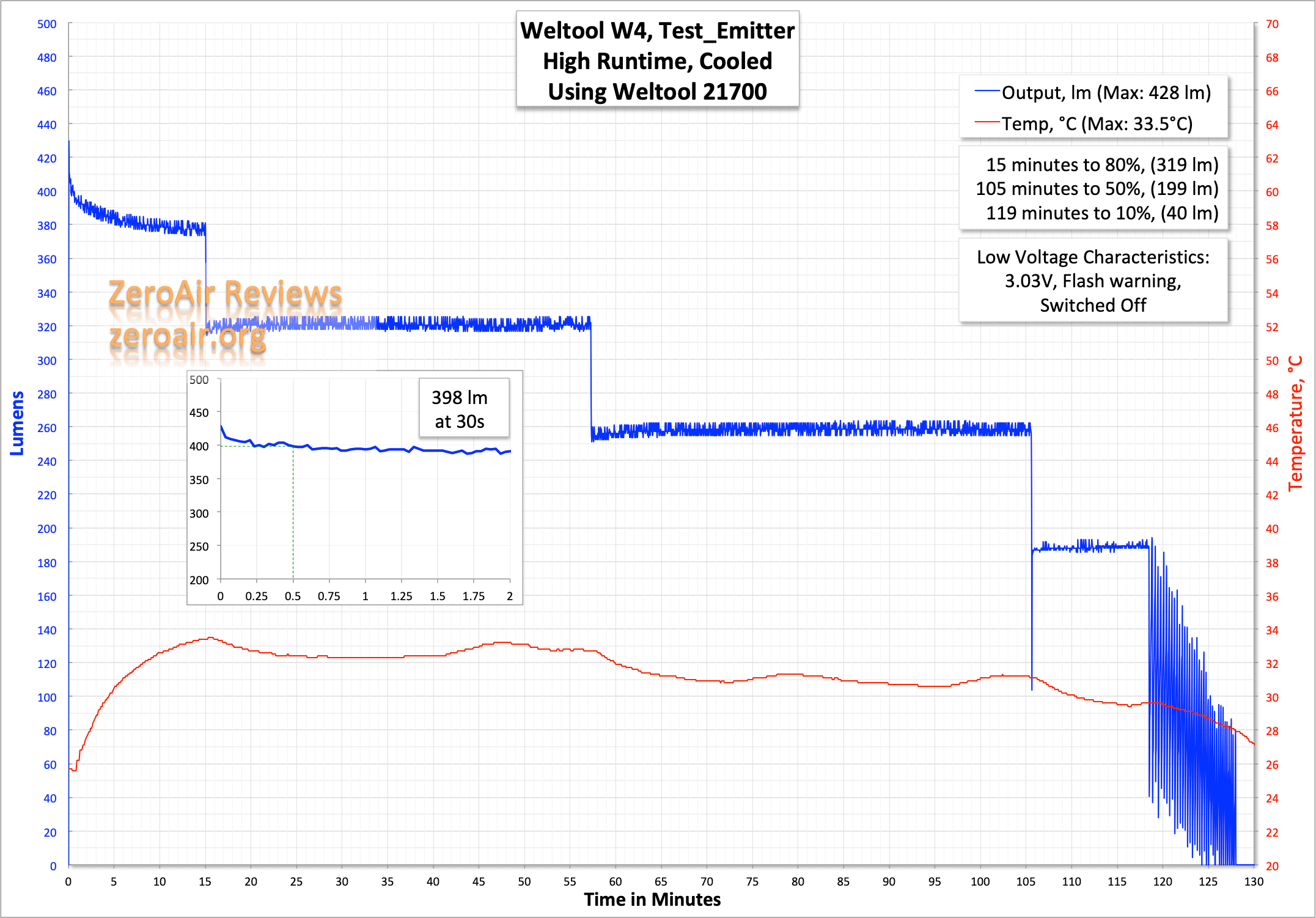 There are a number of stepdowns, and then the light starts flashing (main emitter/only emitter) (which you can see in the runtime). Then the light switches off at around 3V.