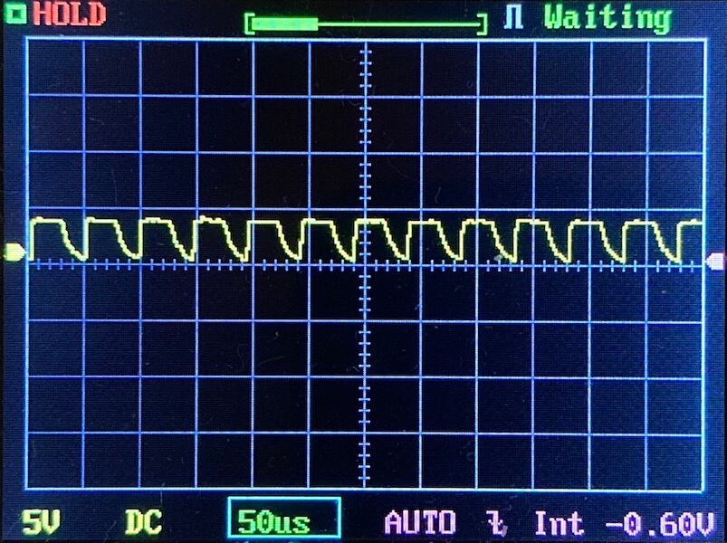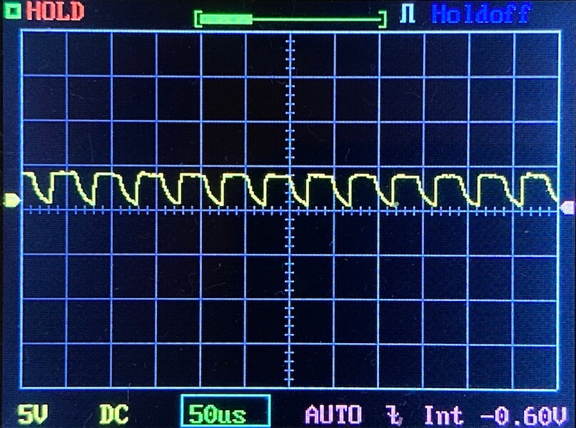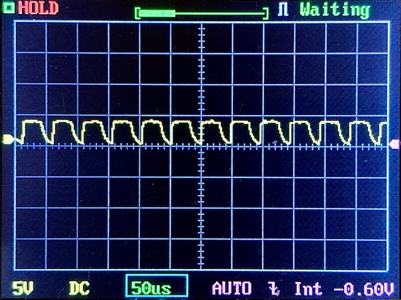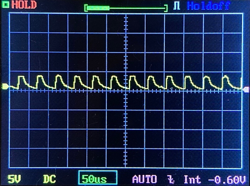 Then there’s the Ultrafire WF-602C flashlight, which has some of the worst PWM I’ve seen. It’s so bad that I used a post about it to explain PWM! Here are multiple timescales (10ms, 5ms, 2ms, 1ms, 0.5ms, 0.2ms) to make comparing this “worst” PWM light to the test light easier. That post also explains why I didn’t test the WF-602C at the usual 50us scale.