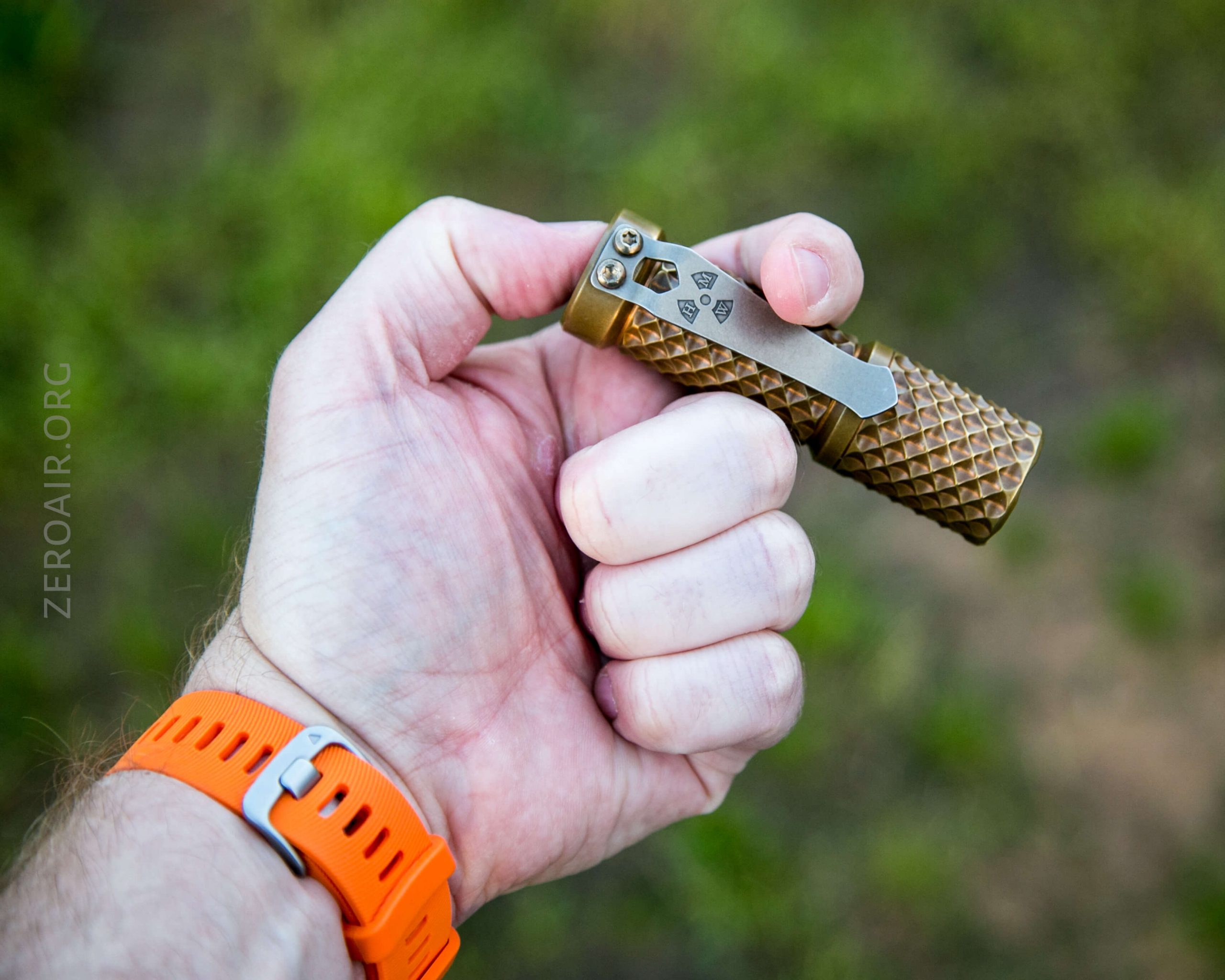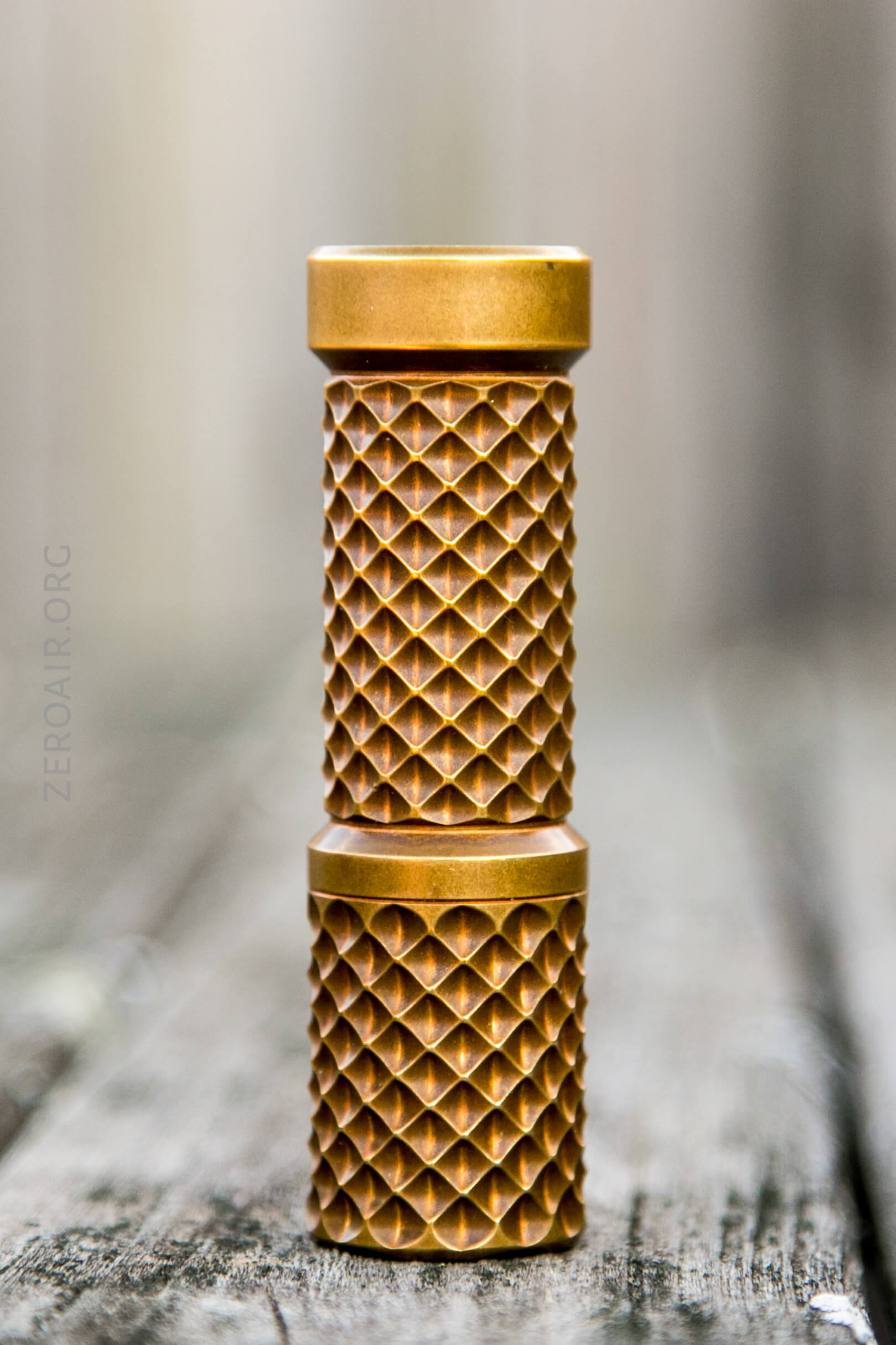 The Total Tesseract has no knurling, but a finish that is very grippy. Body and head are covered with these … indentions … milled into the brass, which peak and add grip.