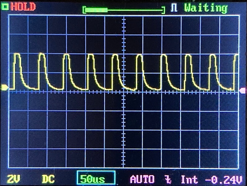 Then there’s the Ultrafire WF-602C flashlight, which has some of the worst PWM I’ve seen. It’s so bad that I used a post about it to explain PWM! Here are multiple timescales (10ms, 5ms, 2ms, 1ms, 0.5ms, 0.2ms) to make comparing this “worst” PWM light to the test light easier. That post also explains why I didn’t test the WF-602C at the usual 50us scale.