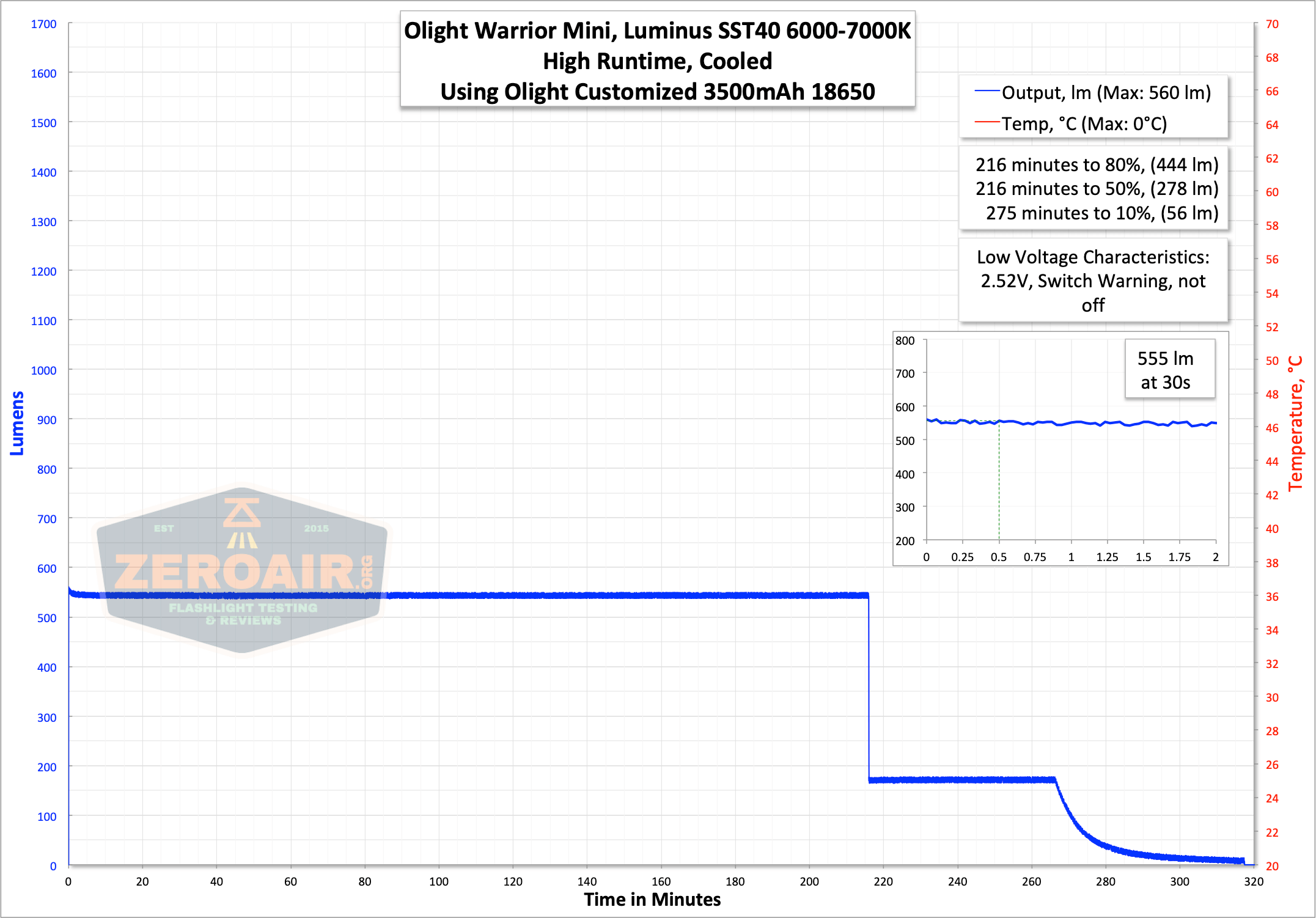 The output on High is nicely flat and regulated, at around 555 lumens. Sorry for no temp here – I had the logger running, but the probe wasn’t connected! (In the test above, the logger cells died, and so the log shuts off at around 280 minutes. When I charged those cells, I forgot to reconnect the probe!)