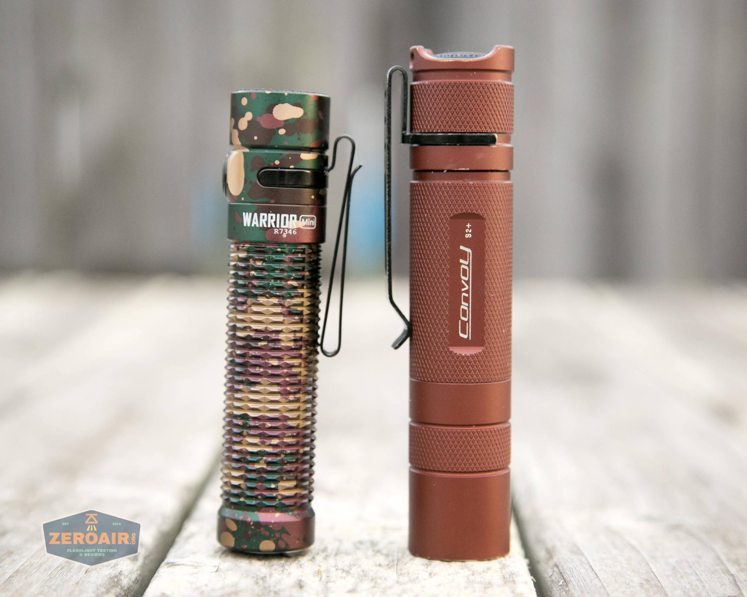 Here’s the test light with the venerable Convoy S2+. Mine is a custom “baked” edition Nichia 219b triple. A very nice 18650 light!