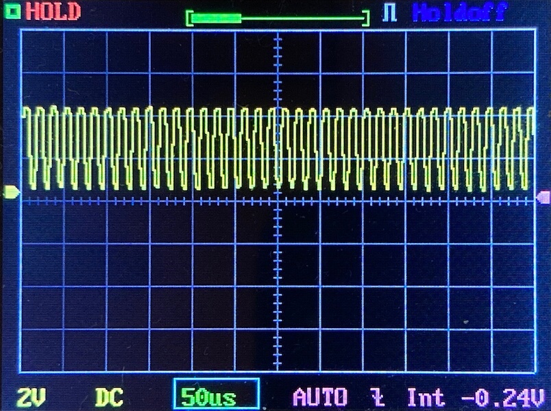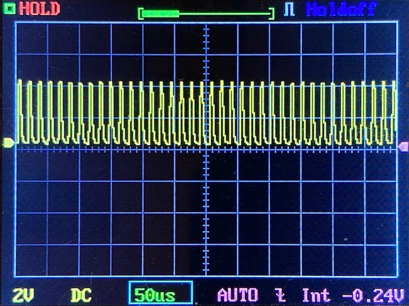 Then there’s the Ultrafire WF-602C flashlight, which has some of the worst PWM I’ve seen. It’s so bad that I used a post about it to explain PWM! Here are multiple timescales (10ms, 5ms, 2ms, 1ms, 0.5ms, 0.2ms) to make comparing this “worst” PWM light to the test light easier. That post also explains why I didn’t test the WF-602C at the usual 50us scale.
