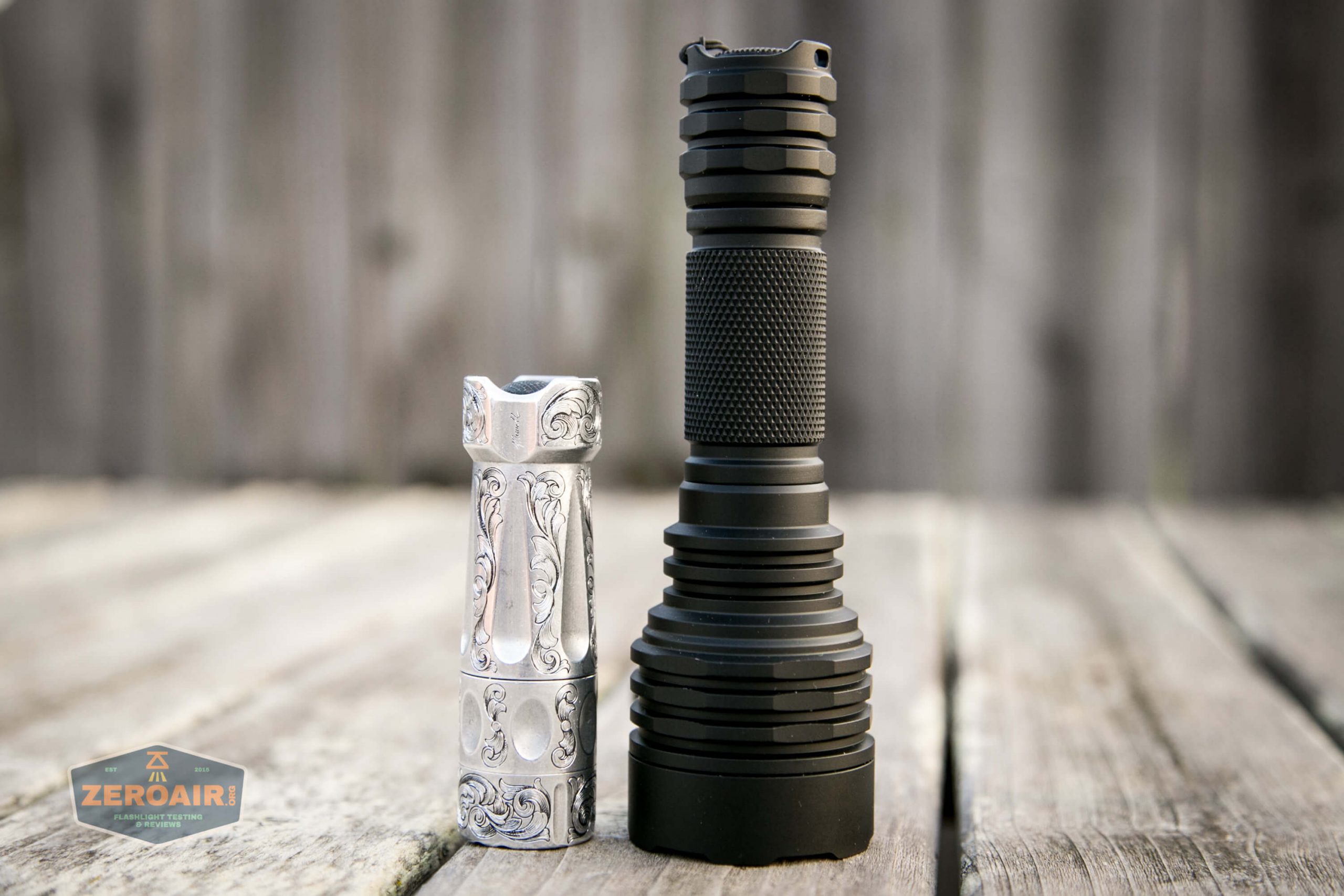 And here’s the light beside my custom-engraved TorchLAB BOSS 35, an 18350 light. I reviewed the aluminum version of that light in both 35 and 70 formats.