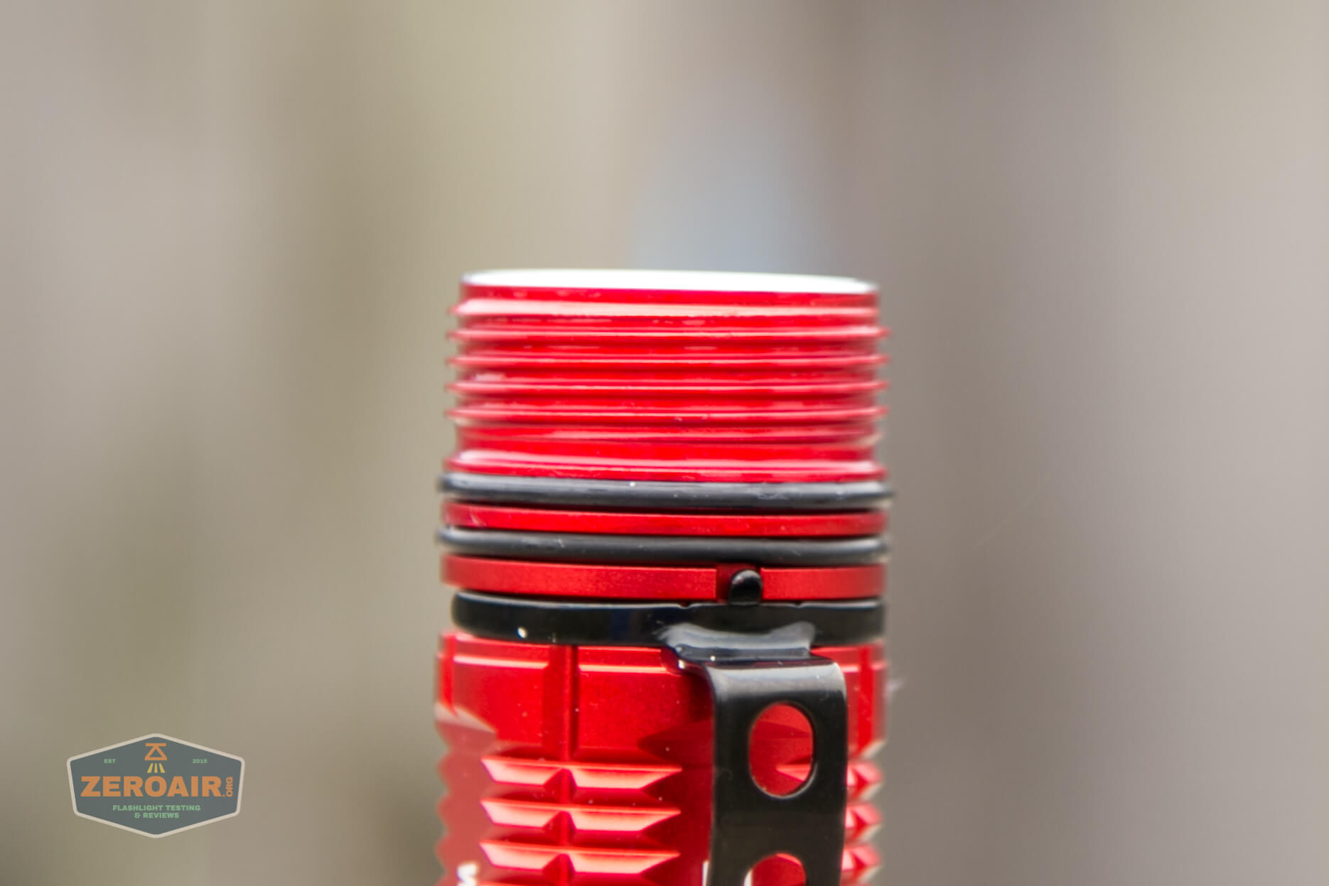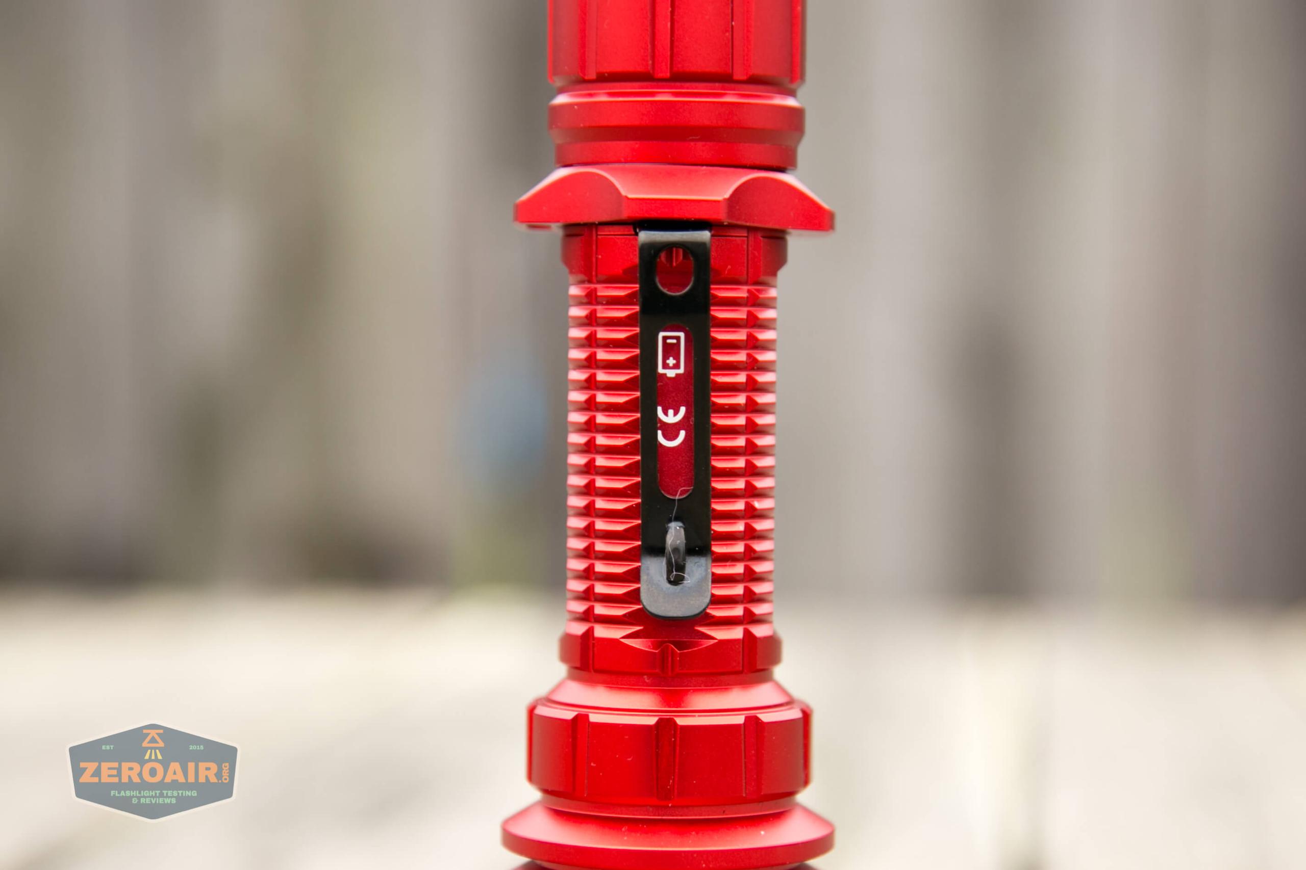 Secondly is the belt clip. It’s a nice clip, which is physically restricted by the keyed aluminum tactical ring. What that means is that with this tactical ring in place, the pocket clip can not fall off. The clip has a couple of places to attach a lanyard. The clip itself is also keyed – it’ll only go in this exact spot, which covers the cell orientation printing.
