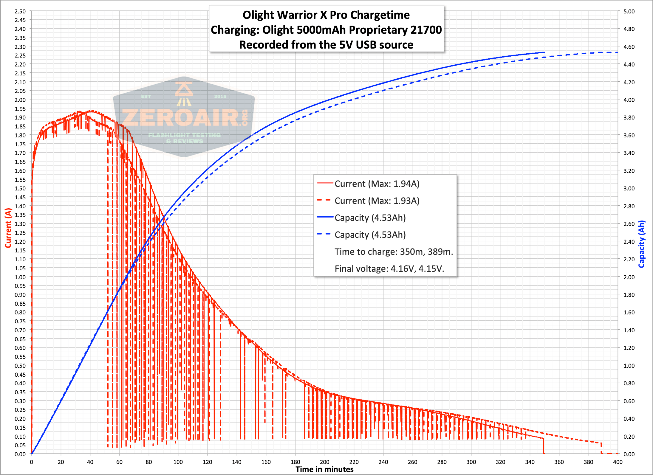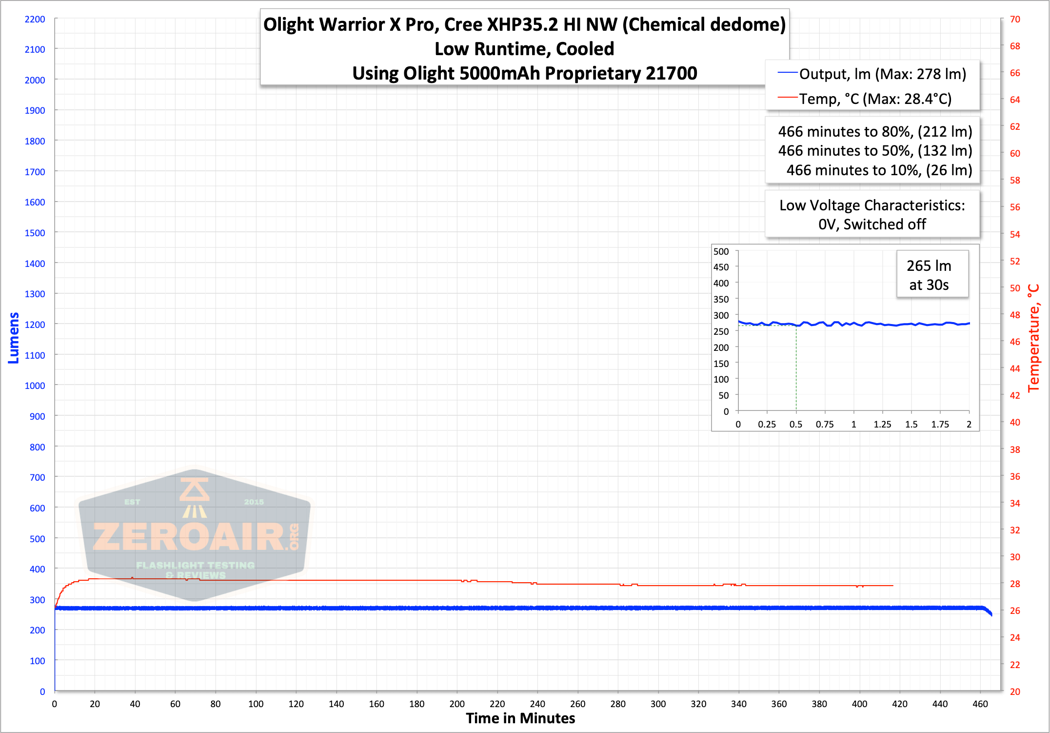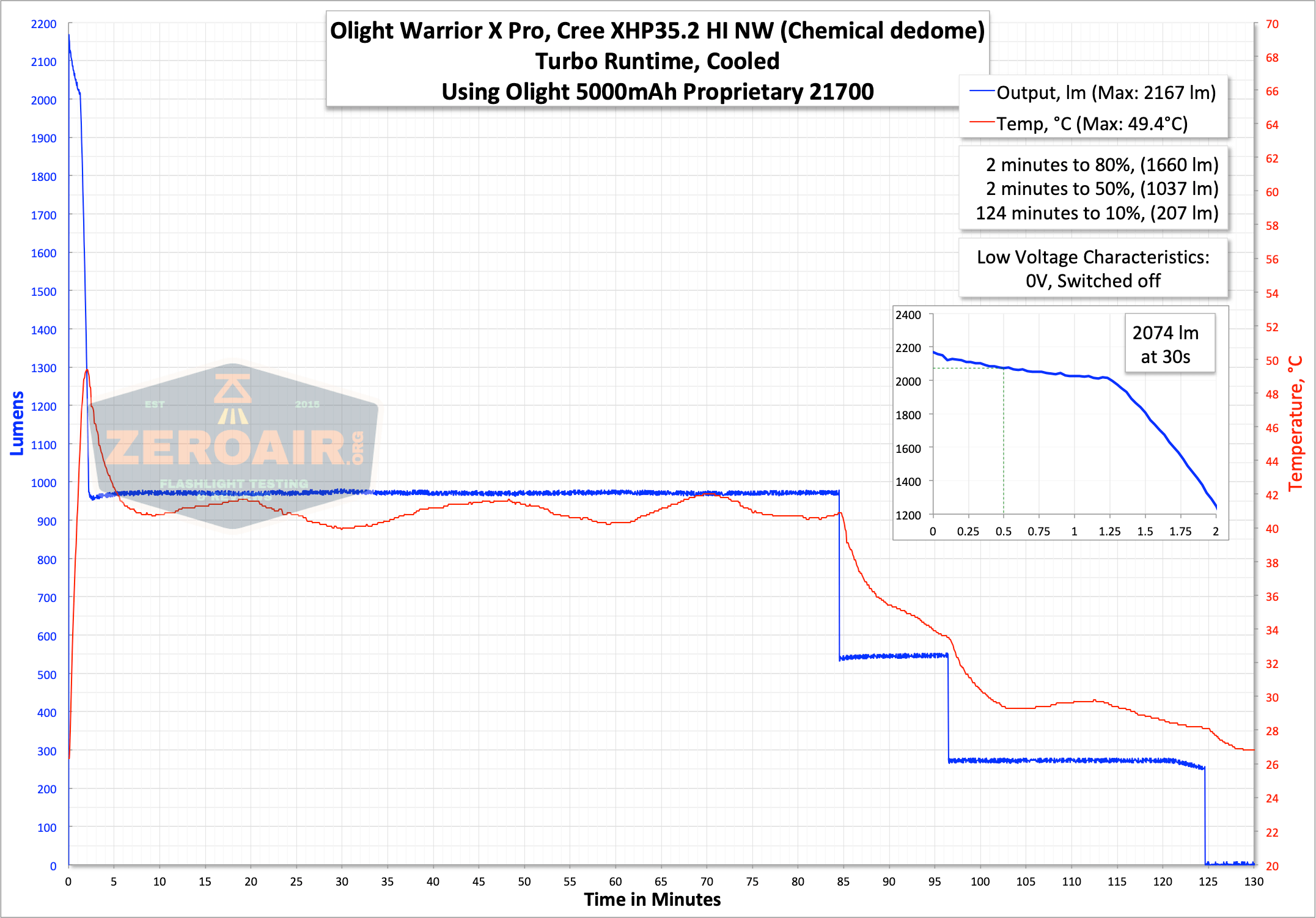 Here are a couple of runtimes. That covers all the modes – there are only two. The runtime looks pretty good – 2074 lumens covers the 2100 lumen claim. That 2100 lumen claim is modified for this light specifically, since the non-NW versions do churn out a little more lumens. The Warrior X Pro holds that output for around 1m 15s, then steps down to around 1000 lumens. The light shuts off after a few step-downs, and that shutoff seems to be when the cell is completely dead. I read 0.0V on the cell after every runtime. That could be cell protection kicking in, or it could be that the cell is actually depleted.