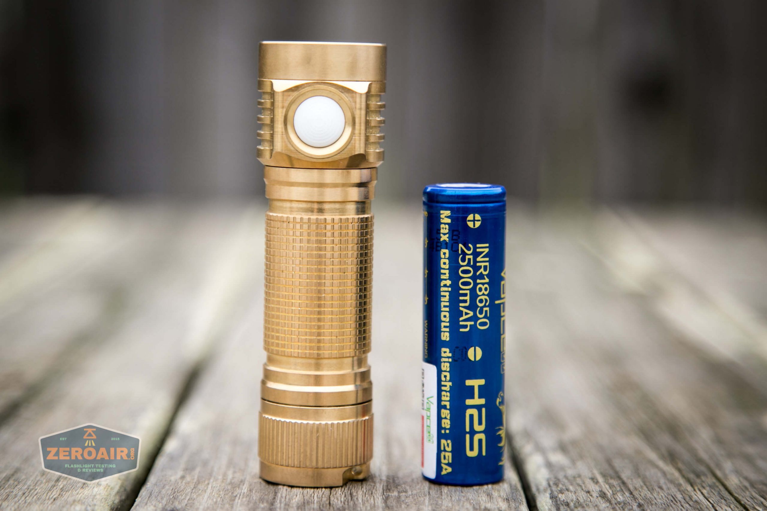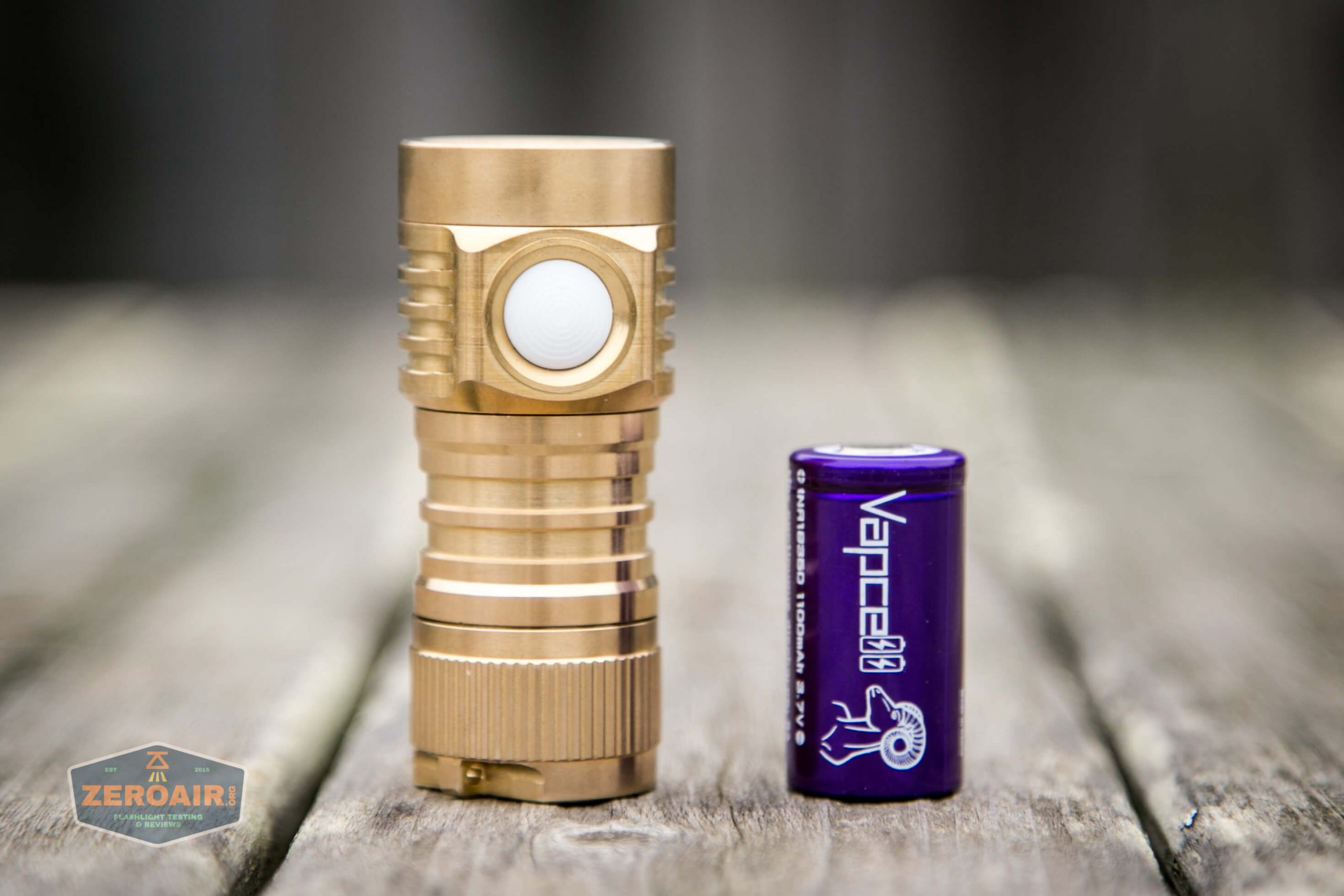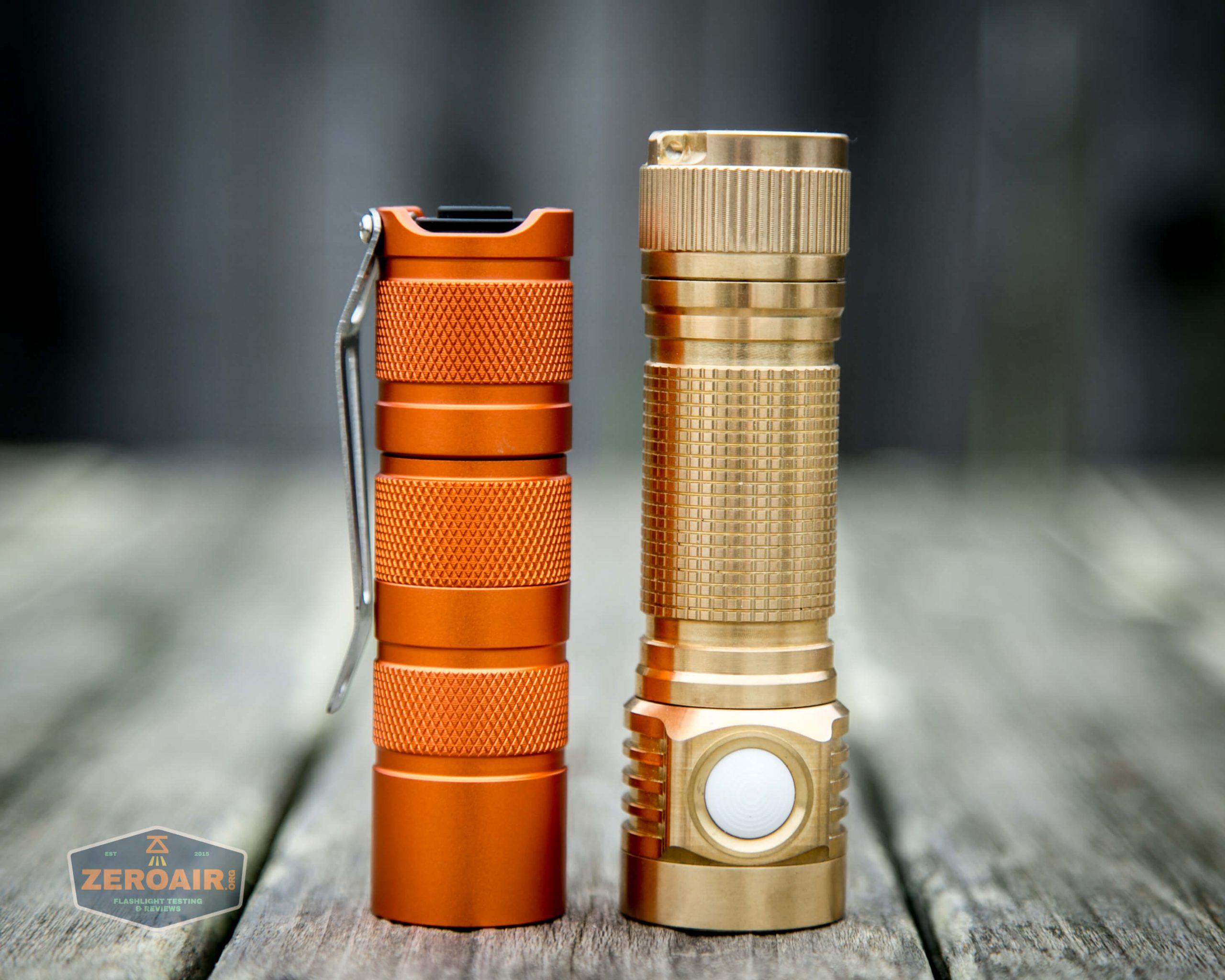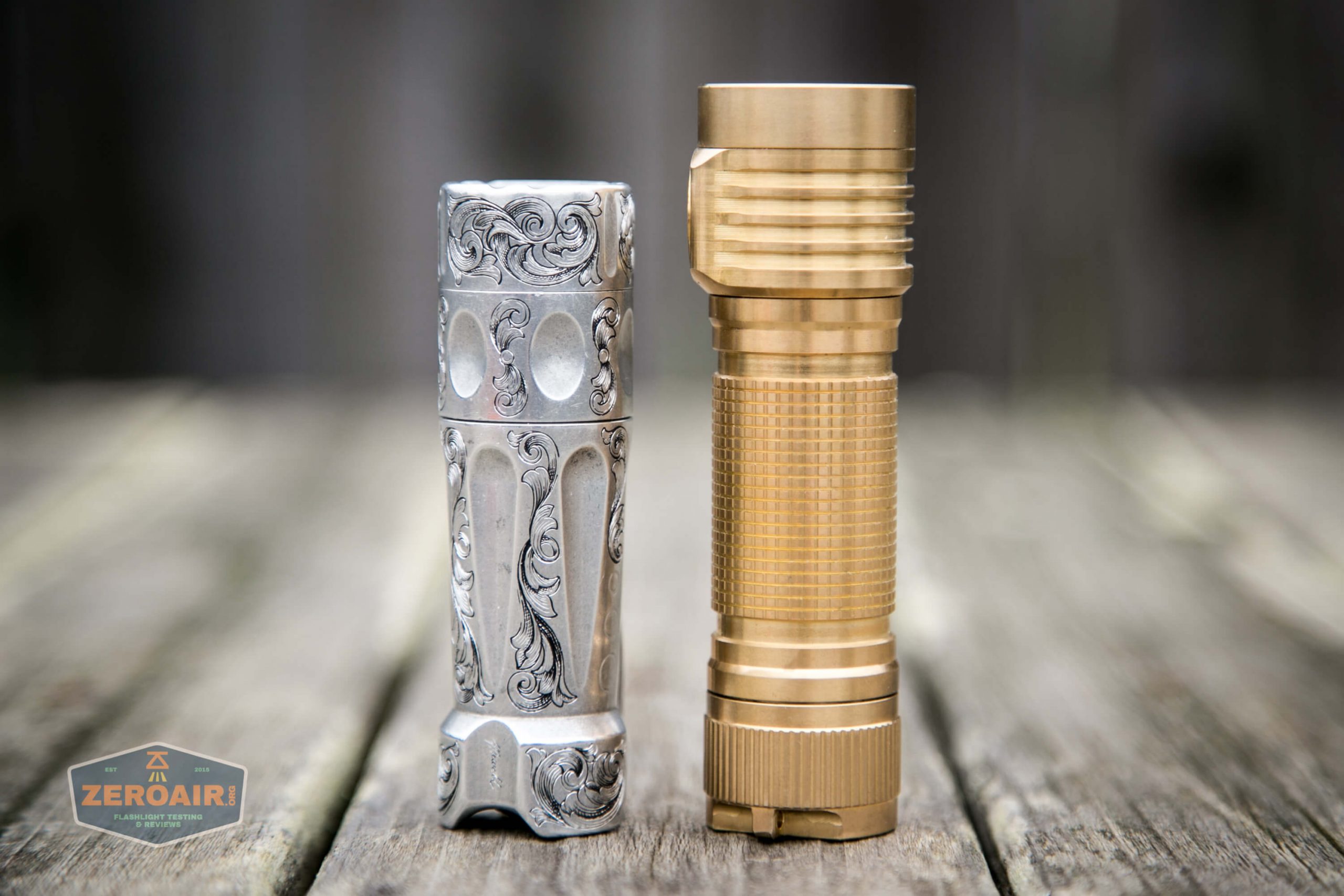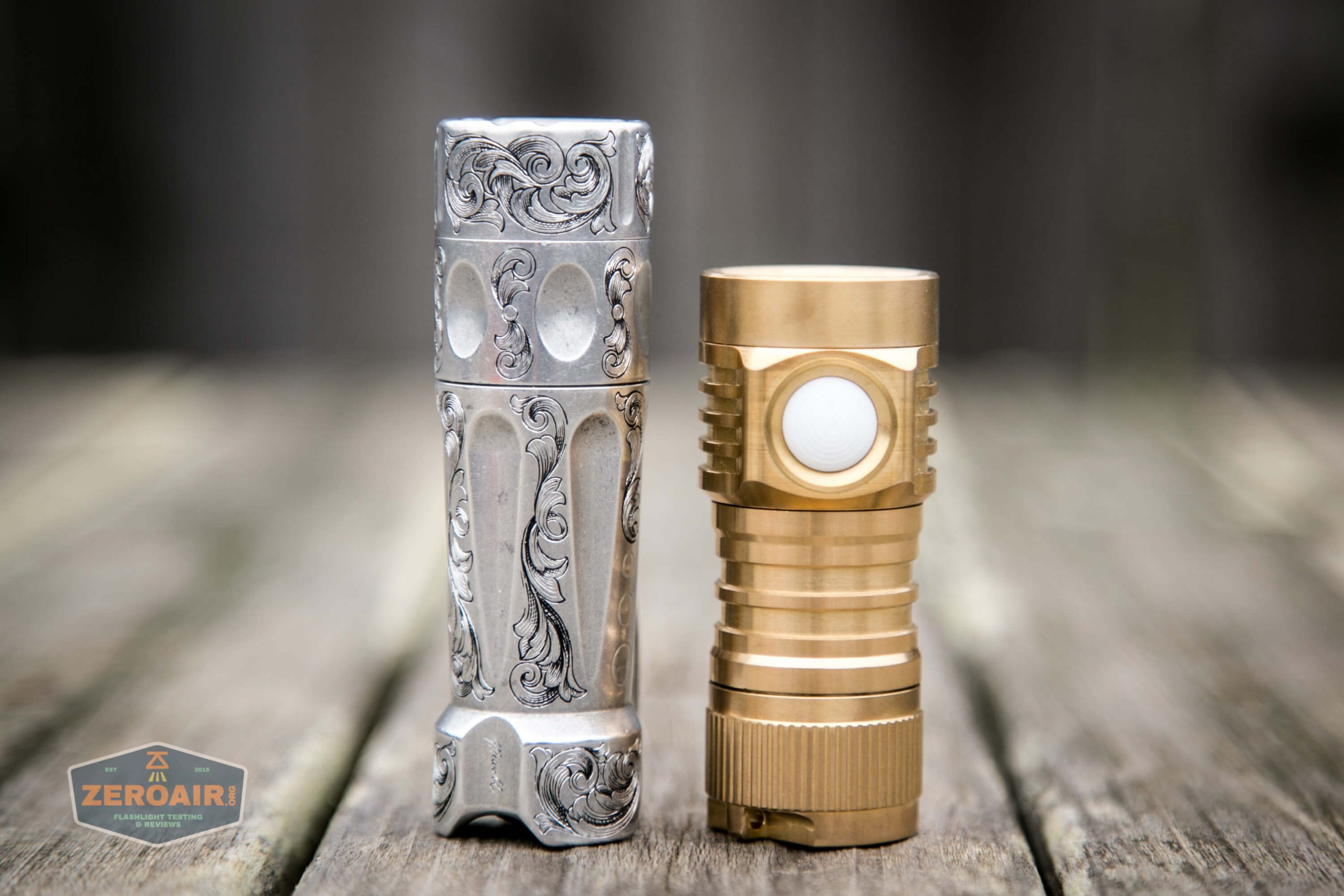 And here’s the light beside my custom-engraved TorchLAB BOSS 35, an 18350 light. I reviewed the aluminum version of that light in both 35 and 70 formats.