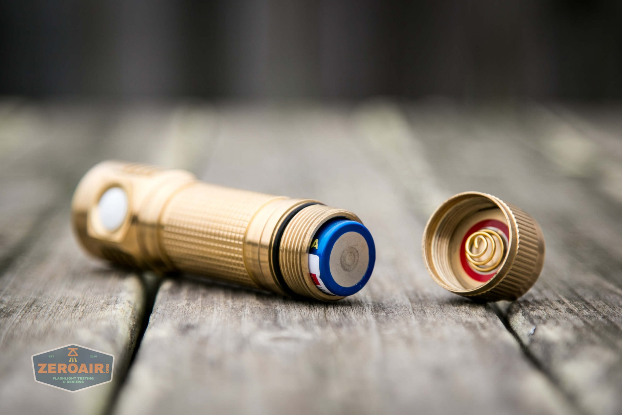 The Emisar D4V2 runs on lithium-ion cells. The default is a single 18650. I tested with a flat top unprotected cell. While other cells will work in the light, even the unprotected cell is a snug fit. These springs are quite stiff, and there’s not excessive room in the cell tube.