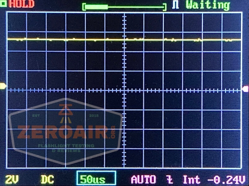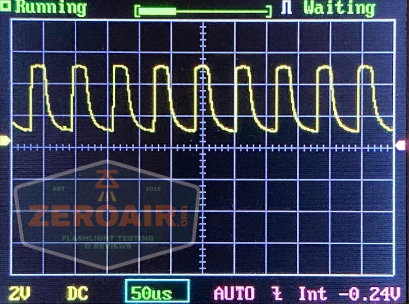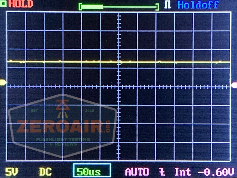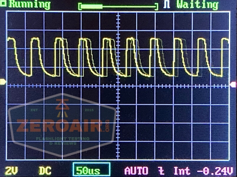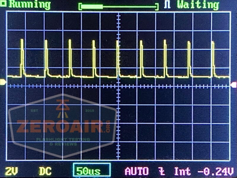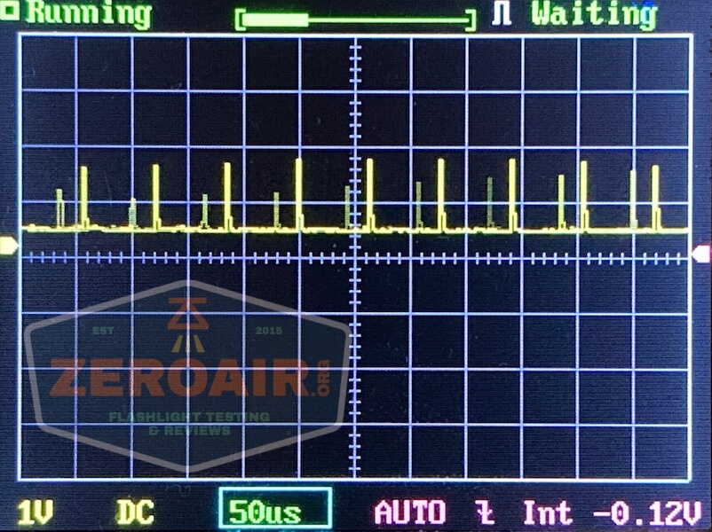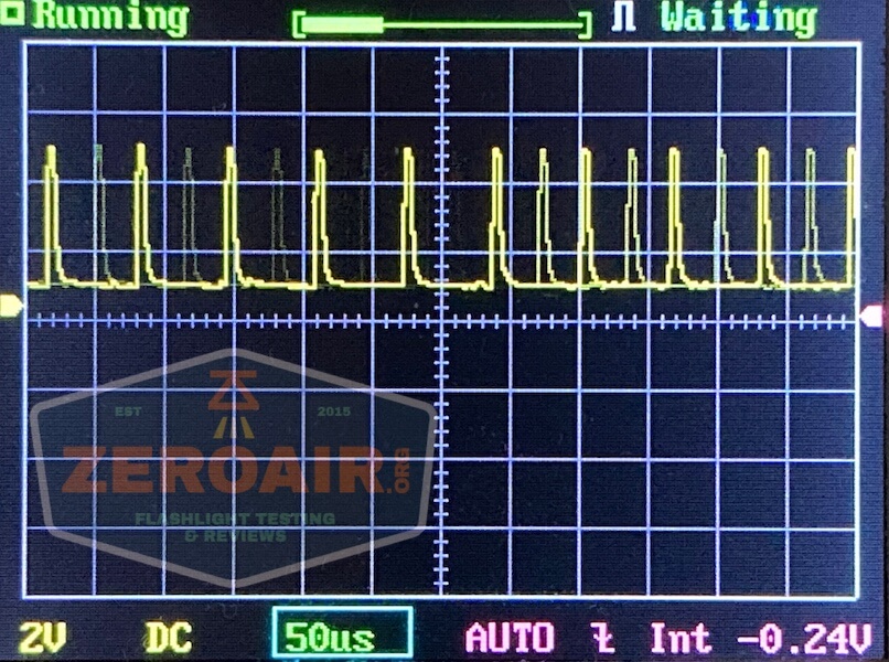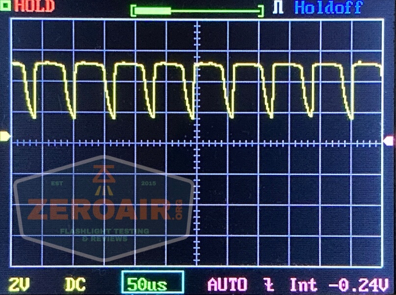 Then there’s the Ultrafire WF-602C flashlight, which has some of the worst PWM I’ve seen. It’s so bad that I used a post about it to explain PWM! Here are multiple timescales (10ms, 5ms, 2ms, 1ms, 0.5ms, 0.2ms) to make comparing this “worst” PWM light to the test light easier. That post also explains why I didn’t test the WF-602C at the usual 50us scale.