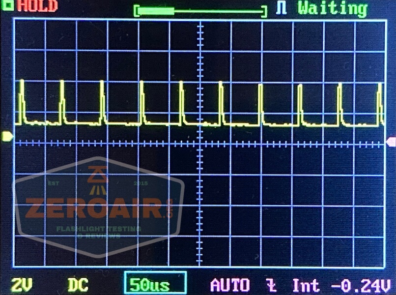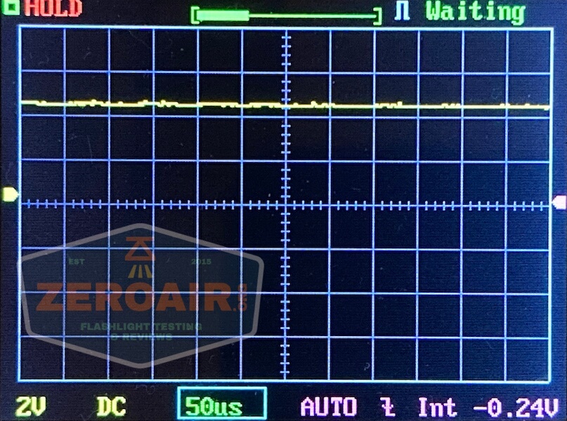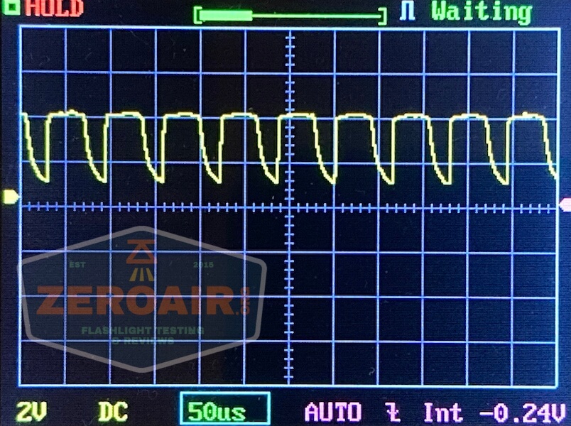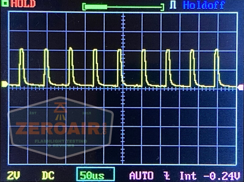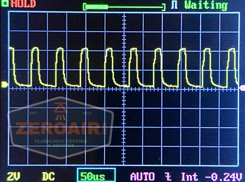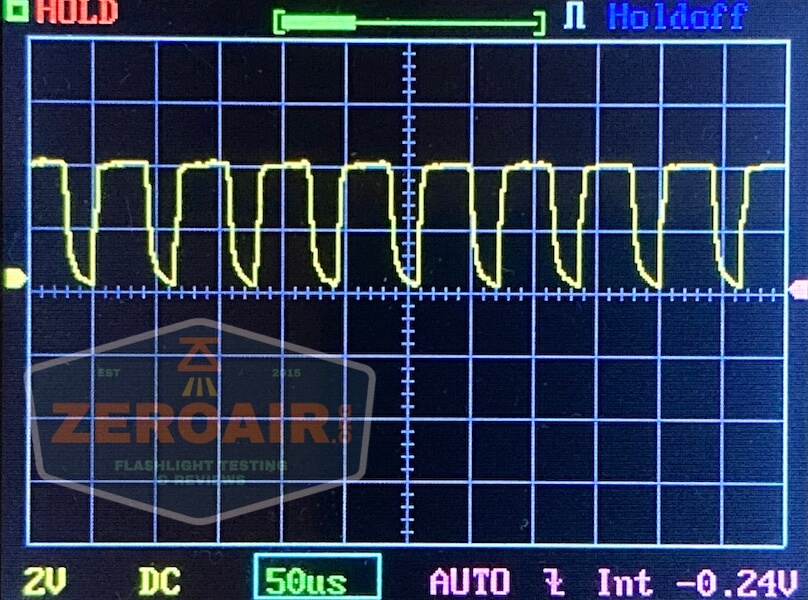Interestingly the Highest of the stepped modes also steps down pretty heavily, again to around 200 lumens. I don’t observe low voltage protection when testing with the bench power, but I’m assured Andúril has it!