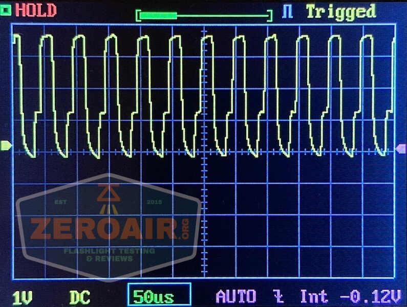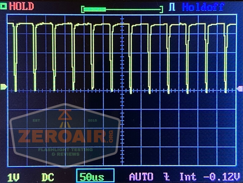 Then there’s the Ultrafire WF-602C flashlight, which has some of the worst PWM I’ve seen. It’s so bad that I used a post about it to explain PWM! Here are multiple timescales (10ms, 5ms, 2ms, 1ms, 0.5ms, 0.2ms) to make comparing this “worst” PWM light to the test light easier. That post also explains why I didn’t test the WF-602C at the usual 50us scale.