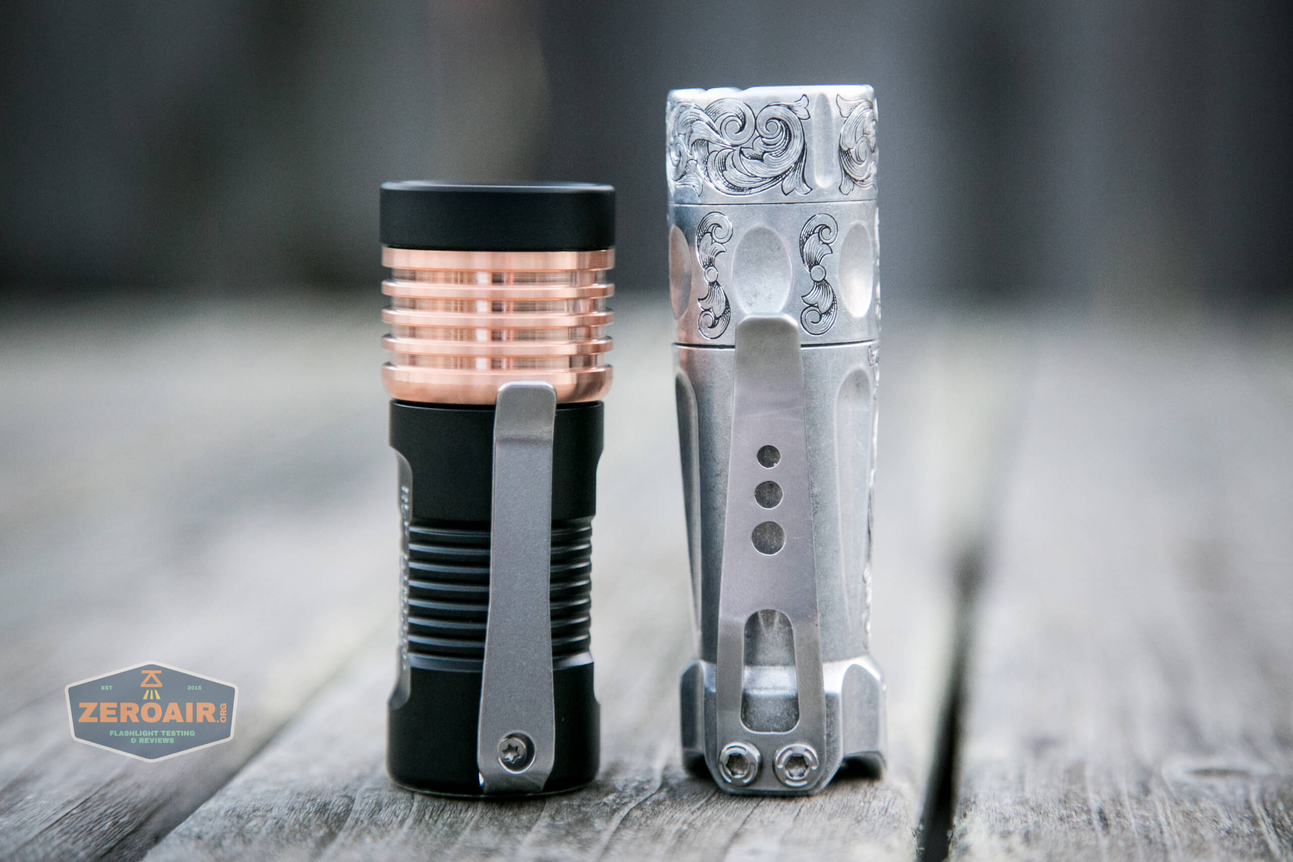 And here’s the light beside my custom-engraved TorchLAB BOSS 35, an 18350 light. I reviewed the aluminum version of that light in both 35 and 70 formats.