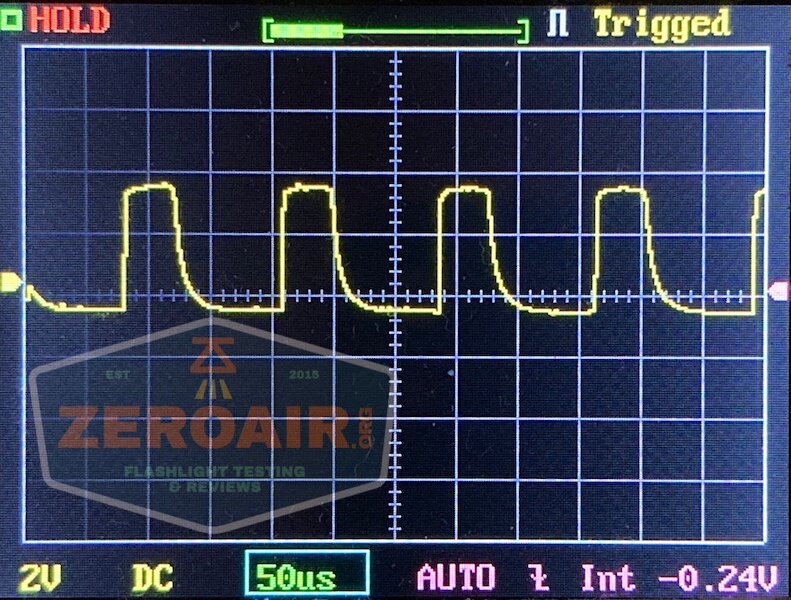 Then there’s the Ultrafire WF-602C flashlight, which has some of the worst PWM I’ve seen. It’s so bad that I used a post about it to explain PWM! Here are multiple timescales (10ms, 5ms, 2ms, 1ms, 0.5ms, 0.2ms) to make comparing this “worst” PWM light to the test light easier. That post also explains why I didn’t test the WF-602C at the usual 50us scale.