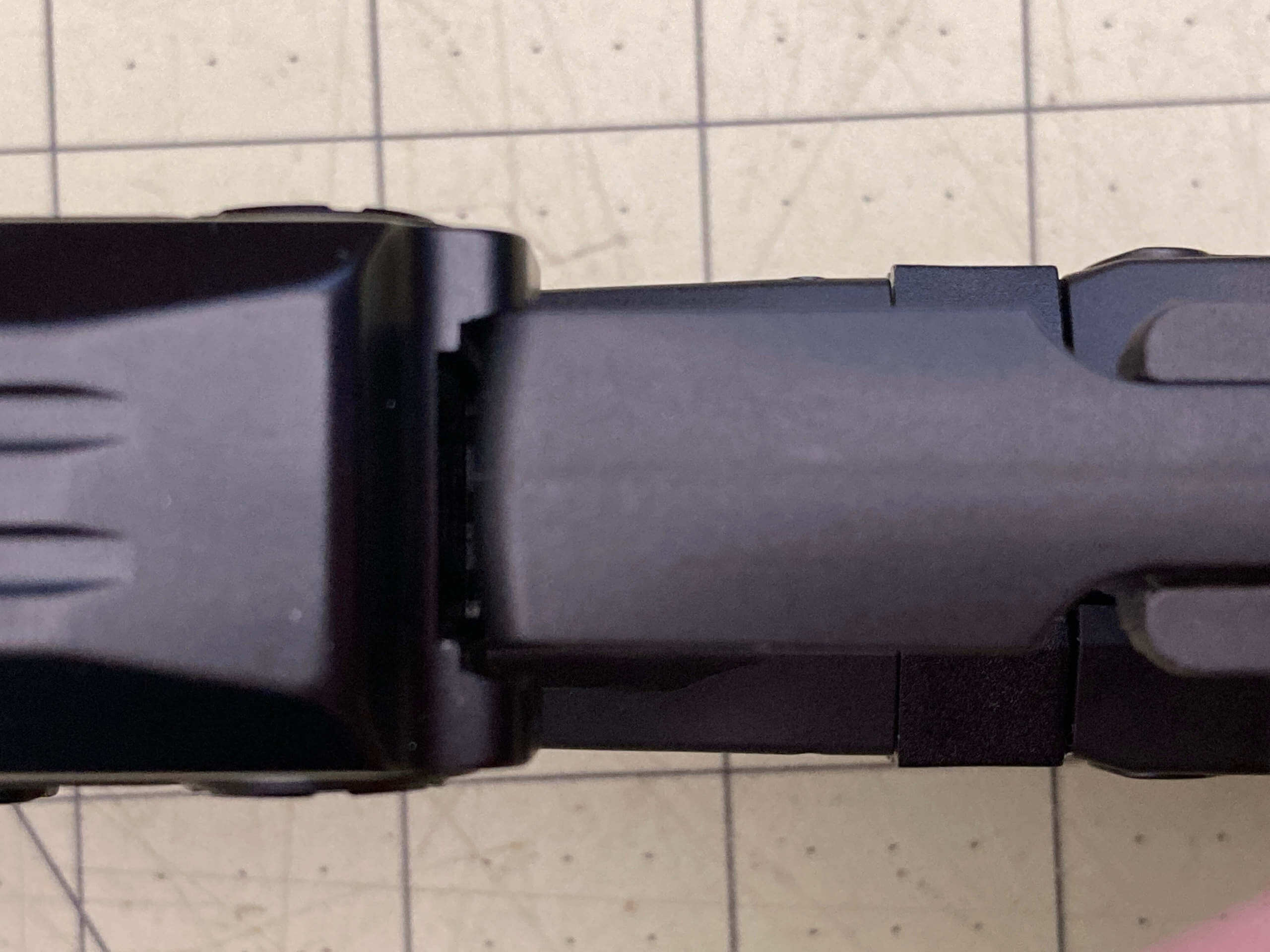 The back or “trigger side” of the UT10 is seen above. You can see where the charge port connects, and you can also see at the top of this there are a few little pips. I believe these serve to keep the charge connector aligned properly.