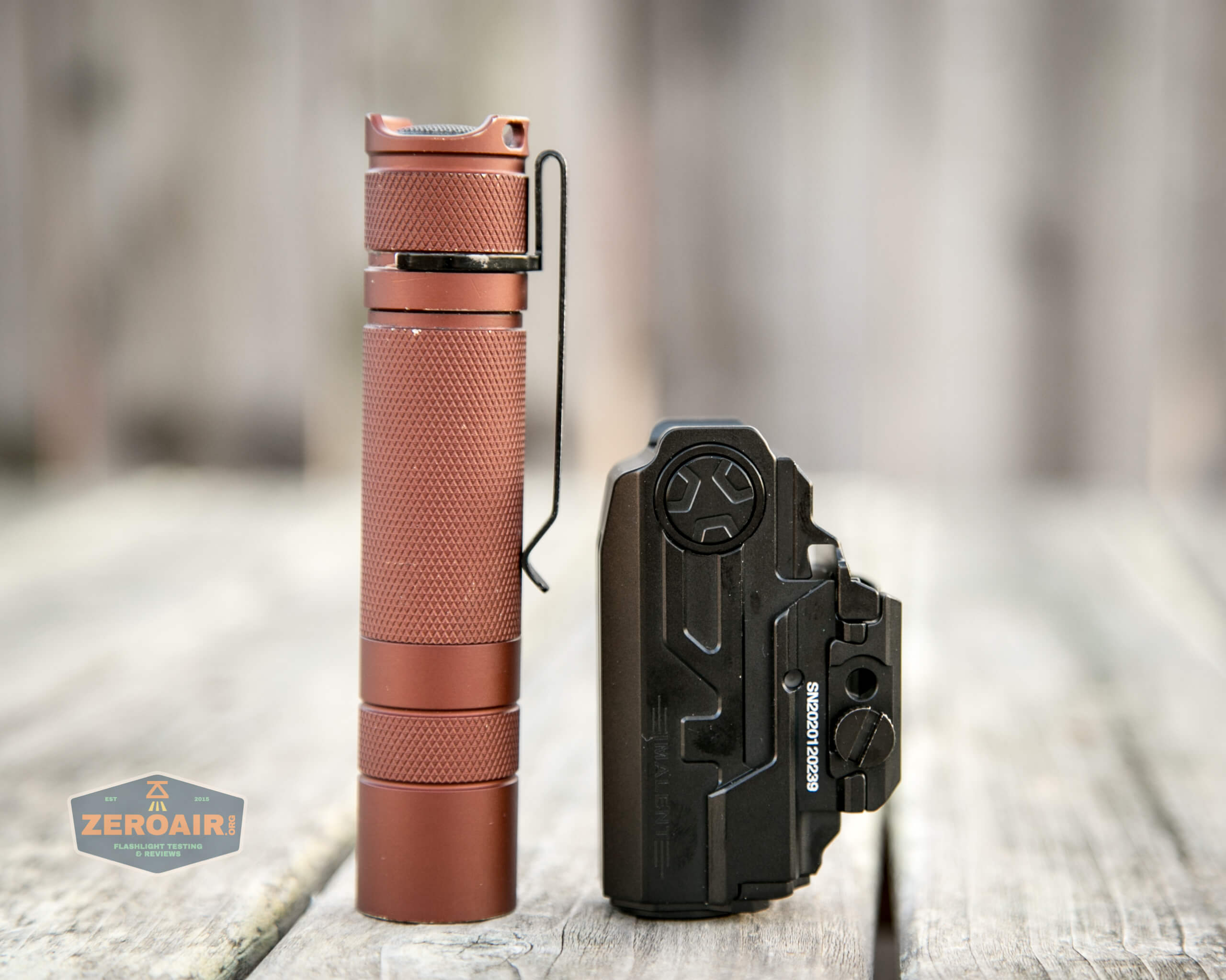And here’s the light beside my custom-engraved TorchLAB BOSS 35, an 18350 light. I reviewed the aluminum version of that light in both 35 and 70 formats.