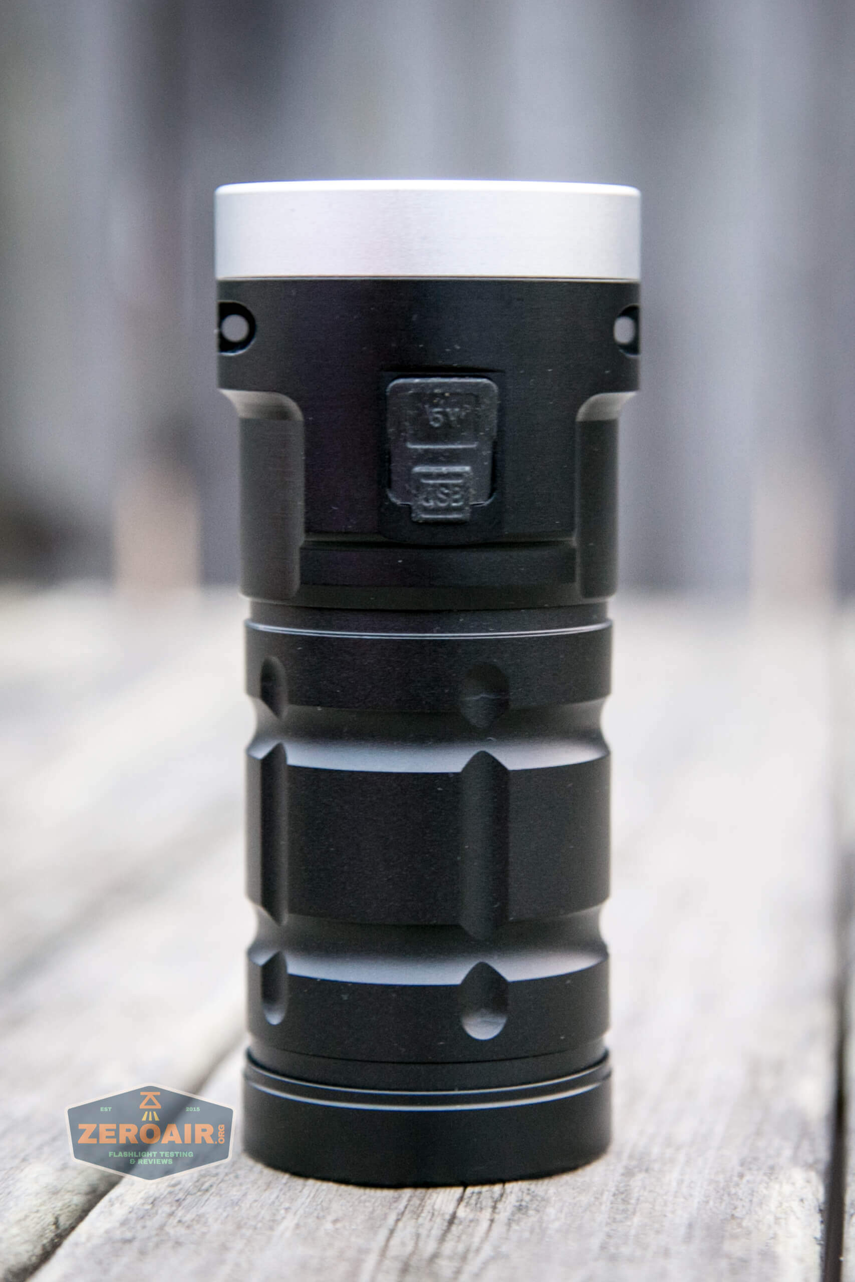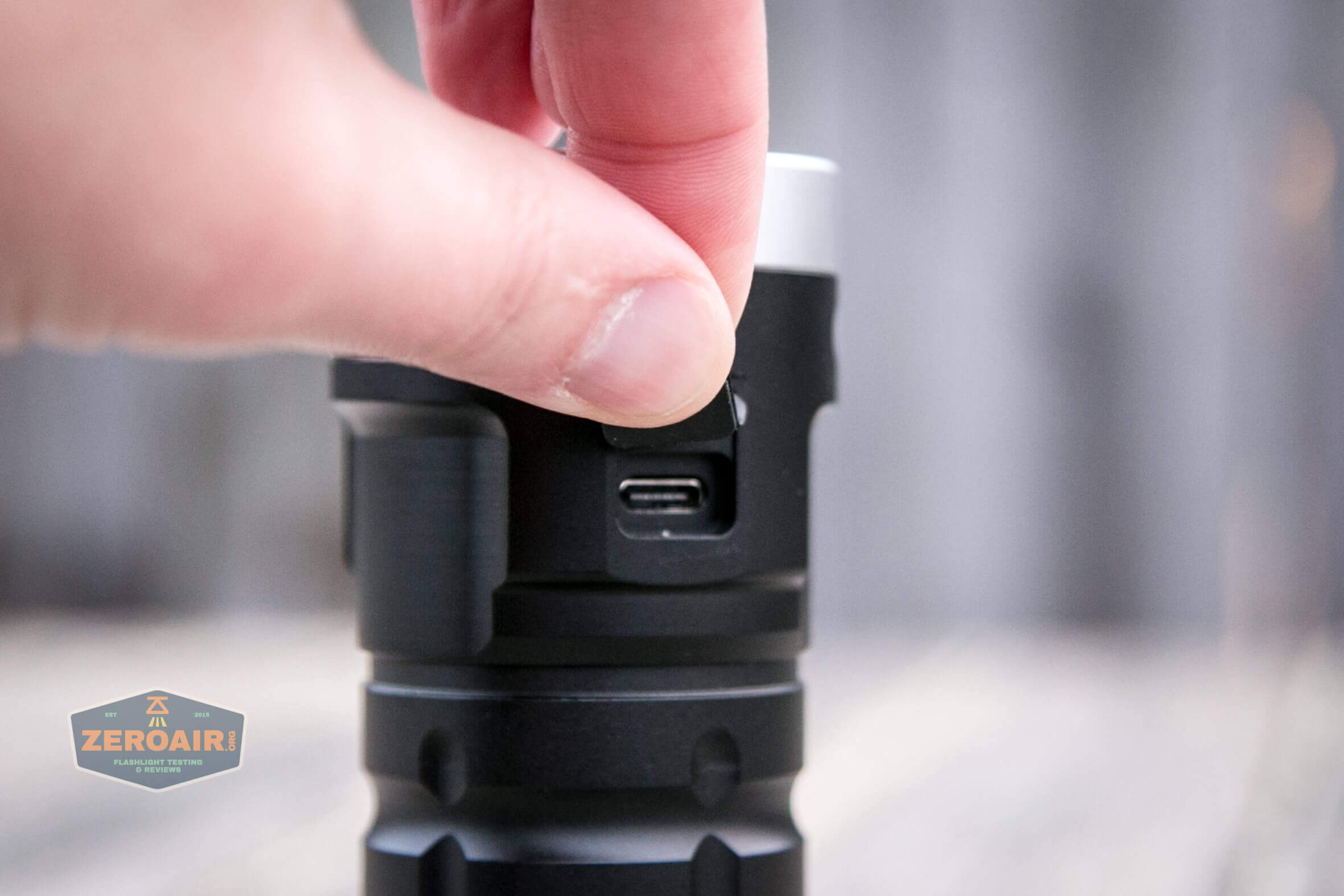Another feature of the Nitebeam X12UV is built-in charging. This charging is by way of a USB-C port in the head. The USB-C port has a nice press-in cover, and is different enough from the switch that you’ll never confuse the two.