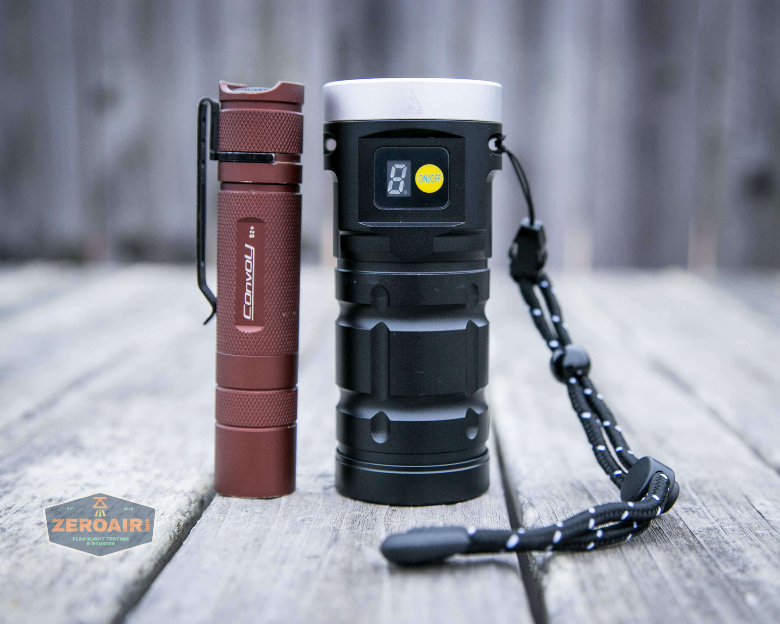 Here’s the test light with the venerable Convoy S2+. Mine’s a custom “baked” edition Nichia 219b triple. A very nice 18650 light.