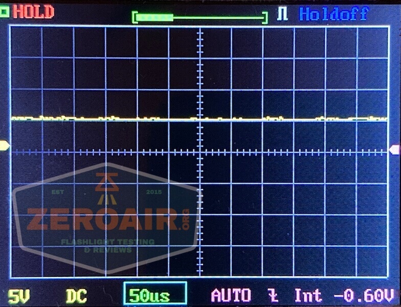 Then there’s the Ultrafire WF-602C flashlight, which has some of the worst PWM I’ve seen. It’s so bad that I used a post about it to explain PWM! Here are multiple timescales (10ms, 5ms, 2ms, 1ms, 0.5ms, 0.2ms) to make comparing this “worst” PWM light to the test light easier. That post also explains why I didn’t test the WF-602C at the usual 50us scale.