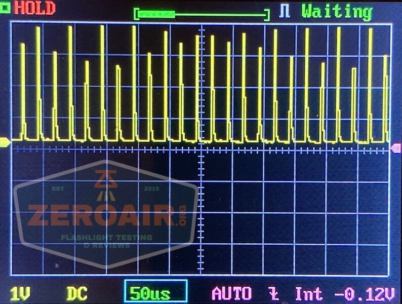 Then there’s the Ultrafire WF-602C flashlight, which has some of the worst PWM I’ve seen. It’s so bad that I used a post about it to explain PWM! Here are multiple timescales (10ms, 5ms, 2ms, 1ms, 0.5ms, 0.2ms) to make comparing this “worst” PWM light to the test light easier. That post also explains why I didn’t test the WF-602C at the usual 50us scale.