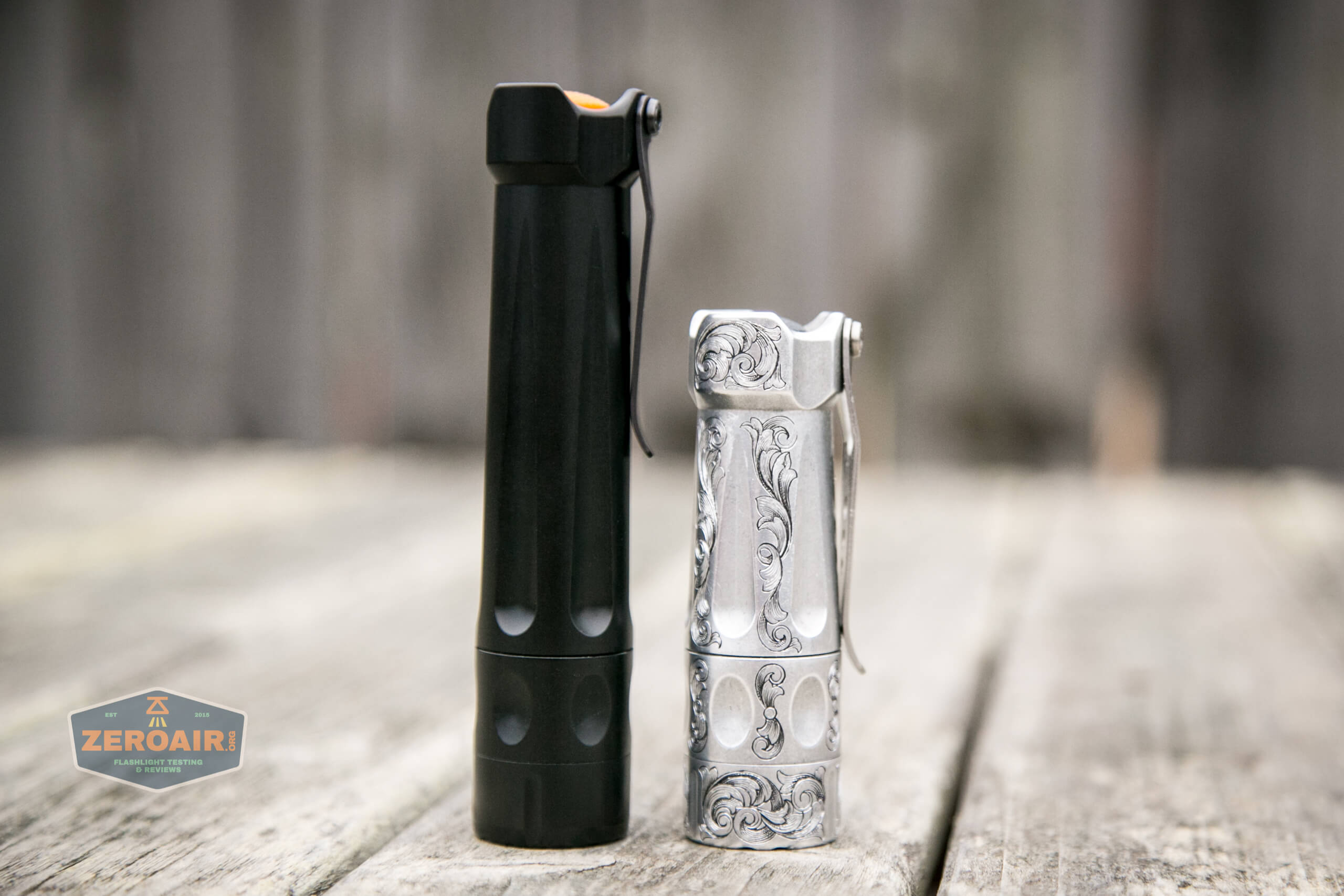 And here’s the light beside my custom-engraved TorchLAB BOSS 35, an 18350 light. I reviewed the aluminum version of that light in both 35 and 70 formats.