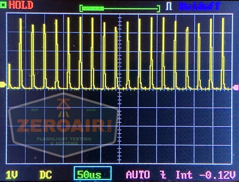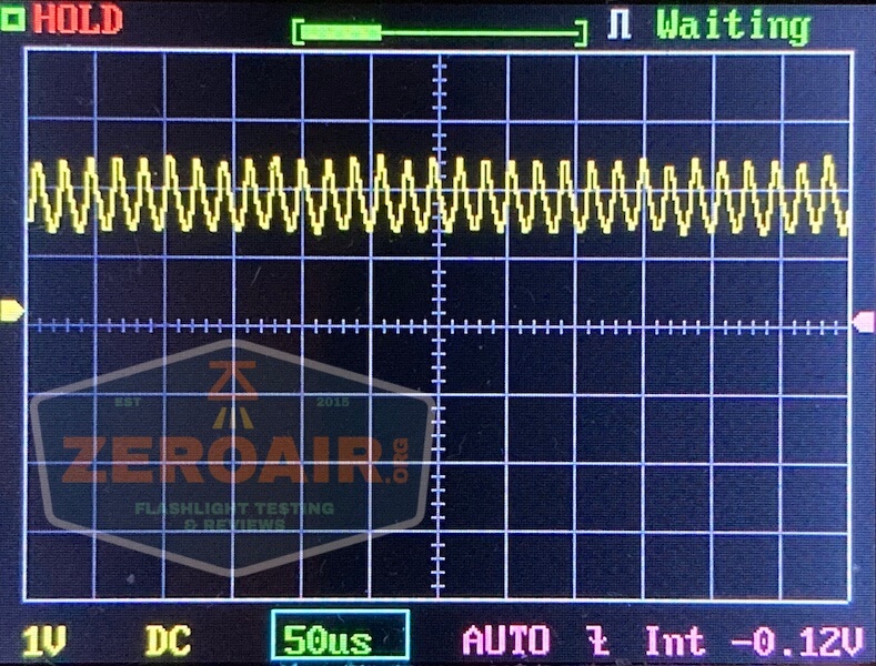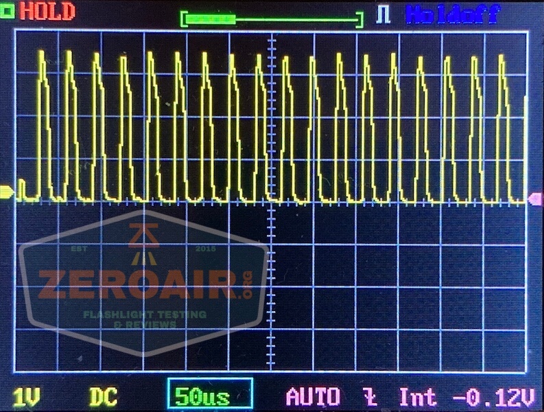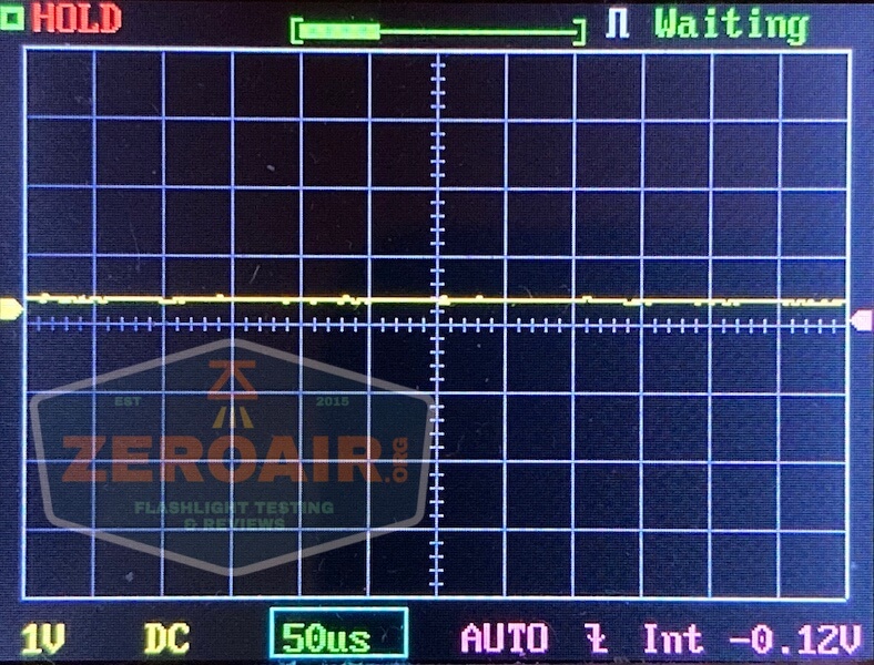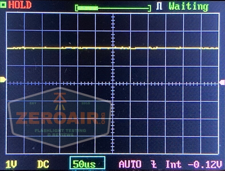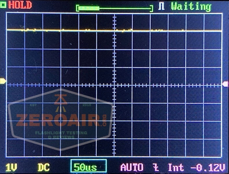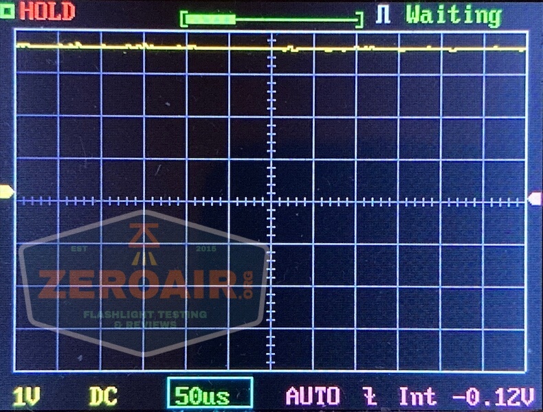 Output on medium looks as above, after the stepdown. Drifting downward with the cell voltage. In this case the light didn’t shut off, but on bench power I did observe the light shutting off at 2.7V. So I’m satisfied with the low voltage protection on this light.