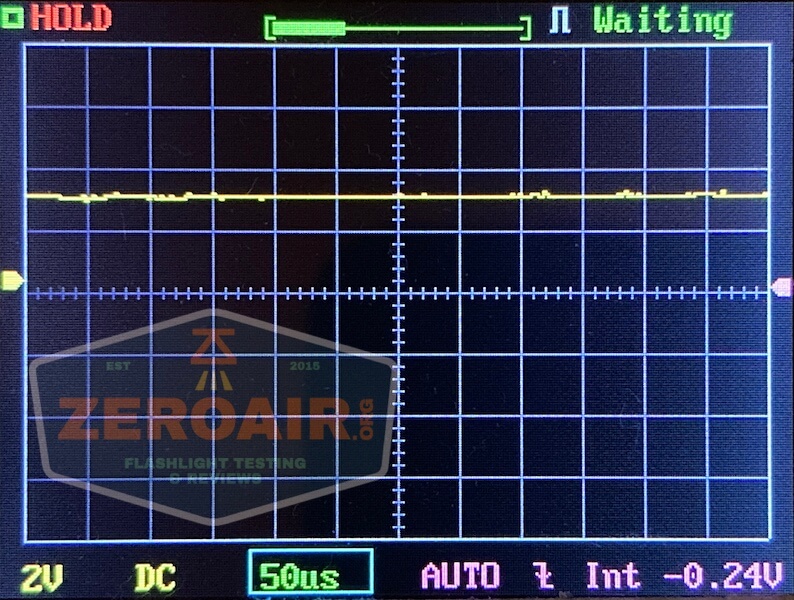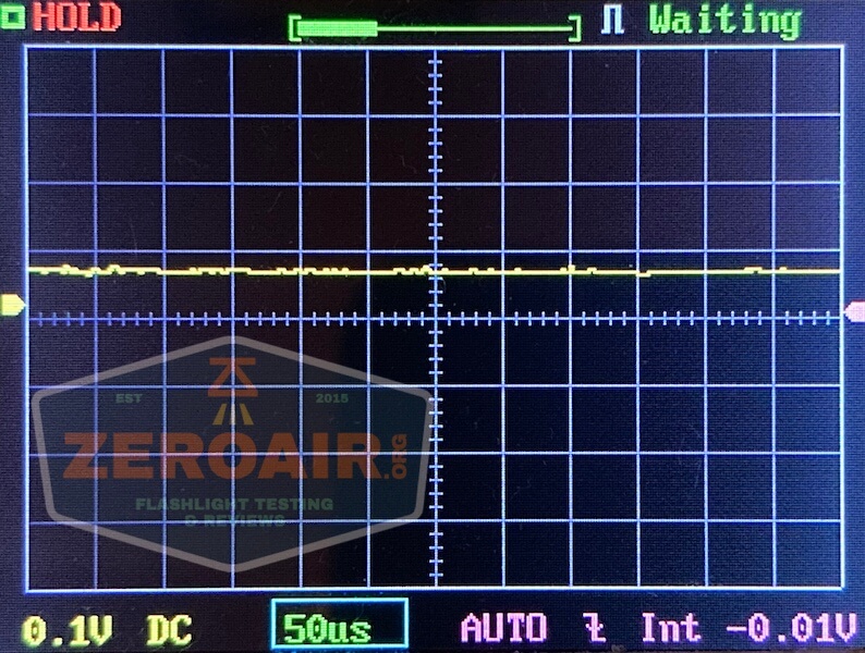 At the end of each of those three tests, you can see some weirdness in the line.  That’s actually the main emitter blinking to alert of low voltage.  The switch blinks at the same time as the main emitter, too, in red, so you’ll certainly note that the cell is low.  However, on bench power, I did not observe the light shutting off due to low voltage.