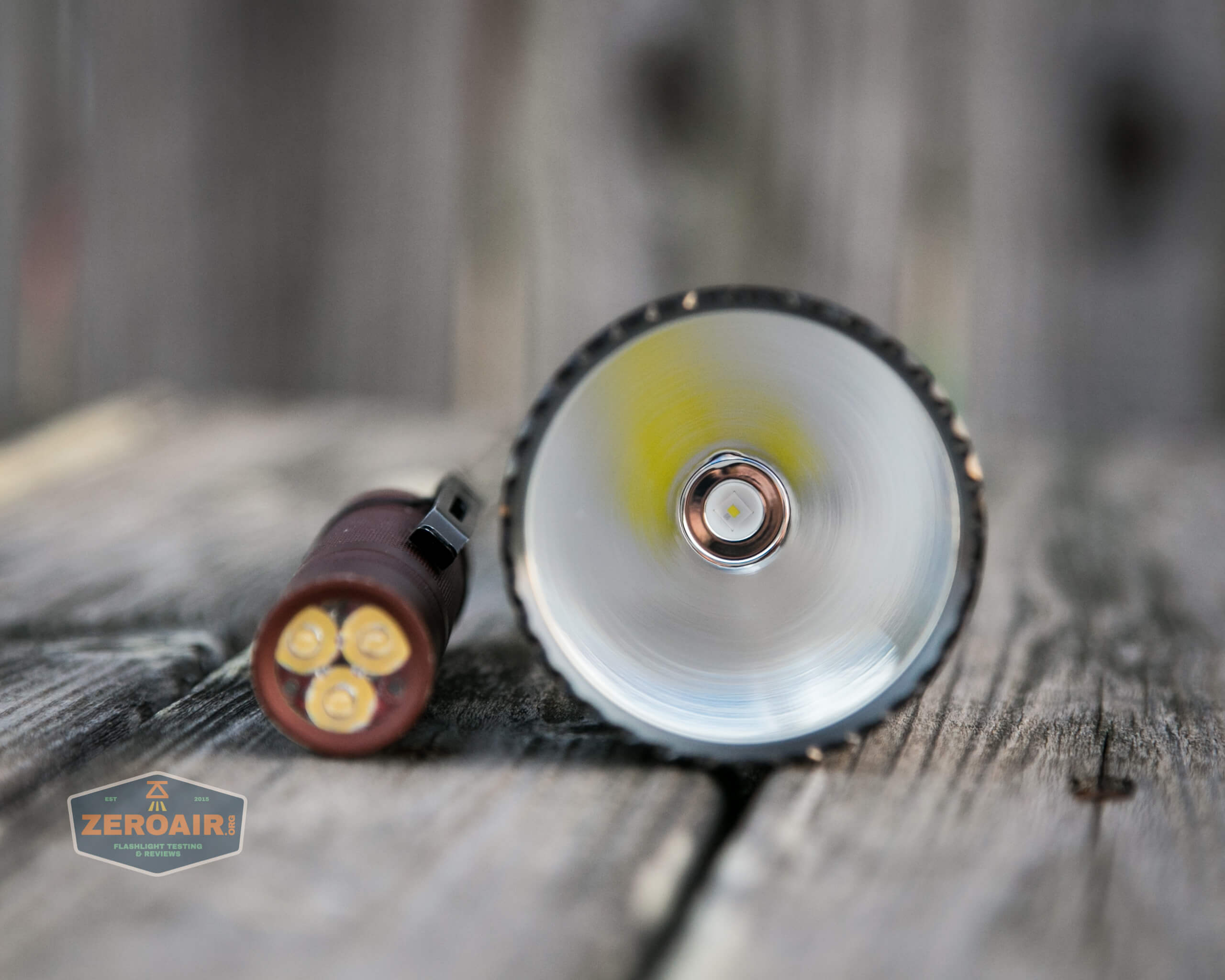 Here’s the test light with the venerable Convoy S2+. Mine’s a custom “baked” edition Nichia 219b triple. A very nice 18650 light.