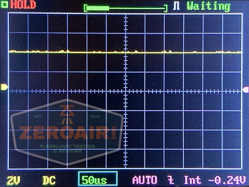 For reference, here’s a baseline shot, with all the room lights off and almost nothing hitting the sensor. Also, here’s the light with the worst PWM I could find. I’m adding multiple timescales, so it’ll be easier to compare to the test light. Unfortunately, the PWM on this light is so bad that it doesn’t even work with my normal scale, with is 50 microseconds (50us). 10ms. 5ms. 2ms. 1ms. 0.5ms. 0.2ms. In a display faster than 0.2ms or so, the on/off cycle is more than one screen, so it’d just (very incorrectly) look like a flat line. I wrote more about this Ultrafire WF-602C flashlight and explained a little about PWM too.