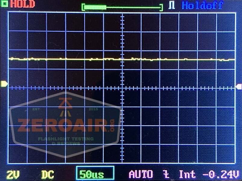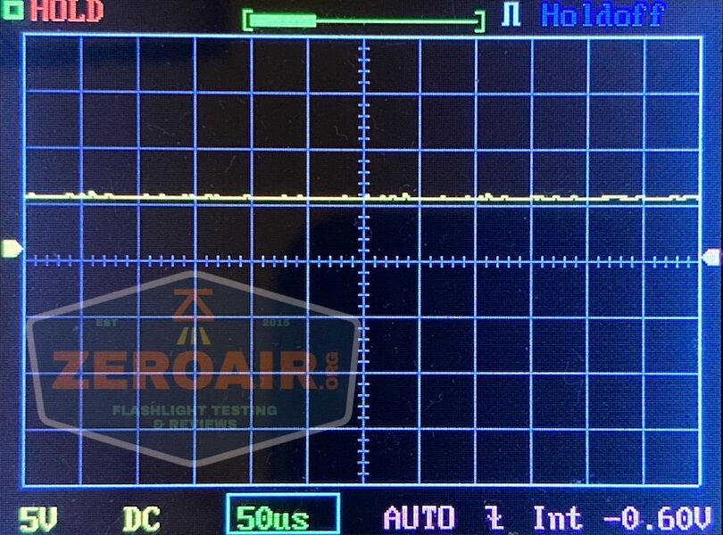 I tested three other modes (all but the lowest mode!). Each displays a main emitter flash when cell voltage is low. Output is very stable on all modes.