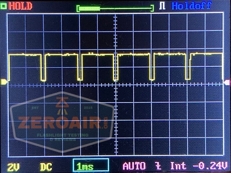 One other issue that I have with this light (aside from the tailcap) is the aggressively bad PWM on every mode. Yes, every mode. Even “Flash.” How can strobe have PWM you ask. Well, it’s like a special level of atrociousness here – First off, the strobe is… well that’s its own kind of PWM, right? Just very very slow (and obviously acceptable). But in the on-times of strobe, that mode displays PWM as well. <shudder>