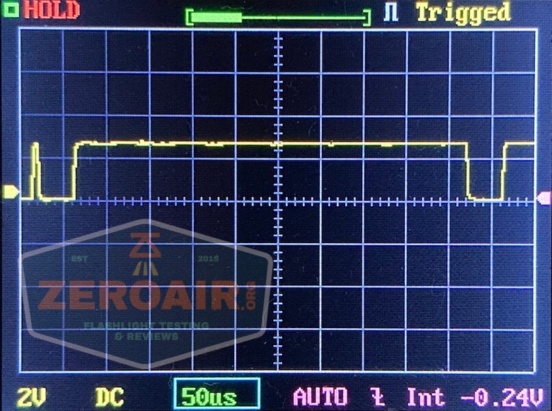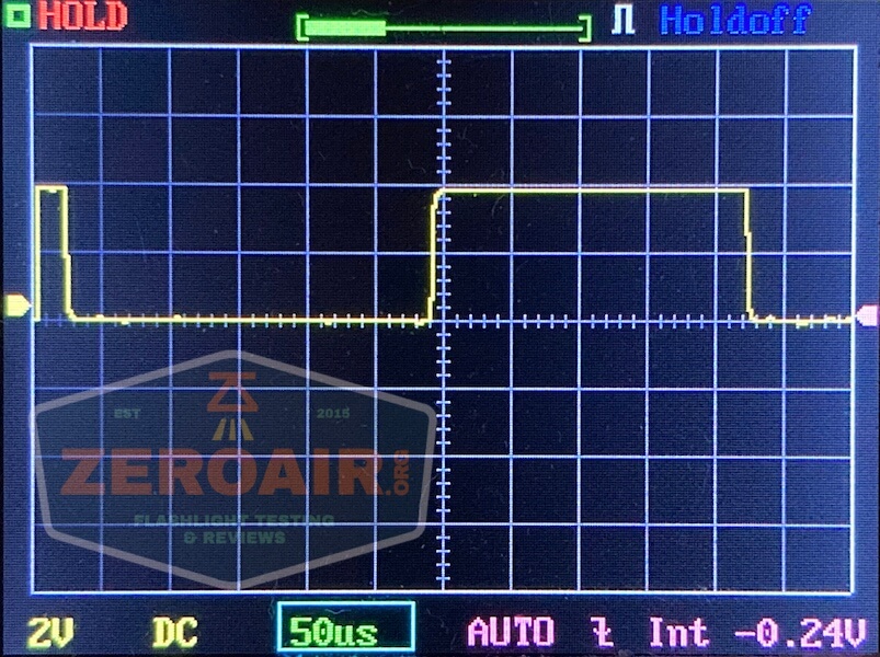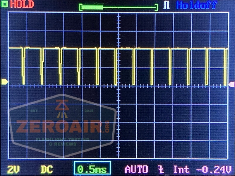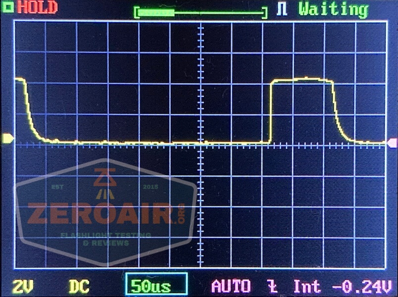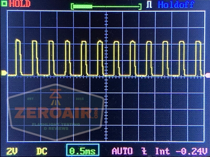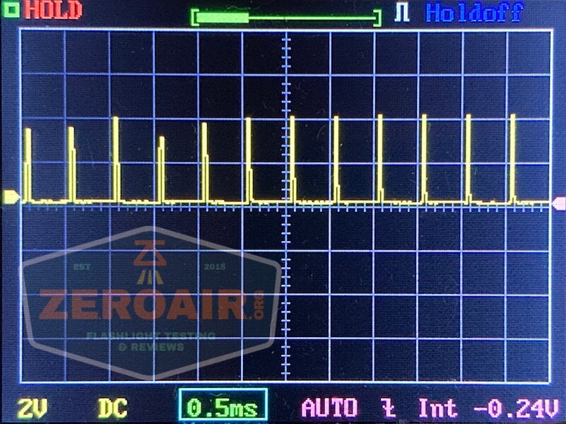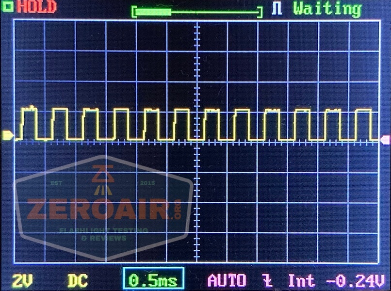 There is PWM on every mode. Such PWM, that I had to change my timescale just to show a complete cycle of it. The PWM is so slow you’d think it would be terribly visible but surprisingly it’s not actually. It is visible, but not oppressive. First, the normal timescale: