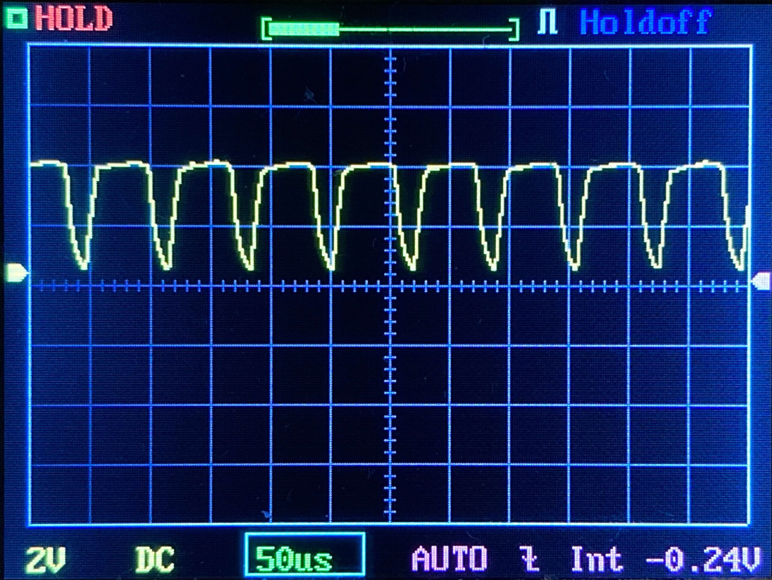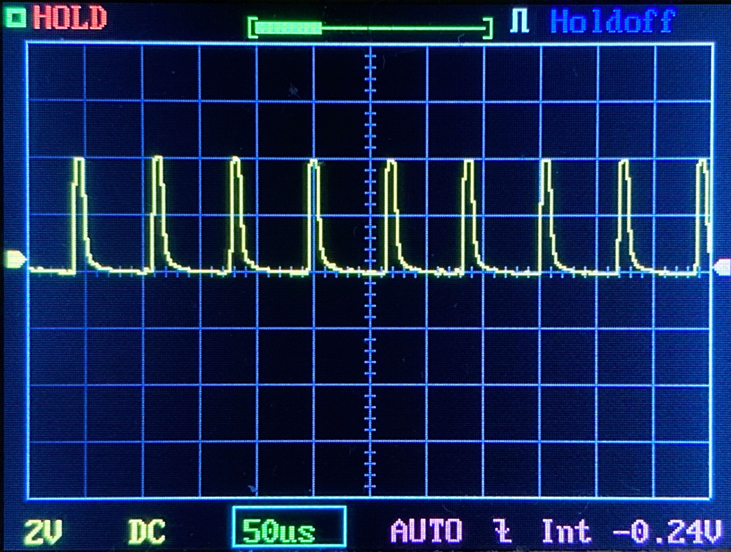 Then there’s the Ultrafire WF-602C flashlight, which has some of the worst PWM I’ve seen. It’s so bad that I used a post about it to explain PWM! Here are multiple timescales (10ms, 5ms, 2ms, 1ms, 0.5ms, 0.2ms) to make comparing this “worst” PWM light to the test light easier. That post also explains why I didn’t test the WF-602C at the usual 50us scale.