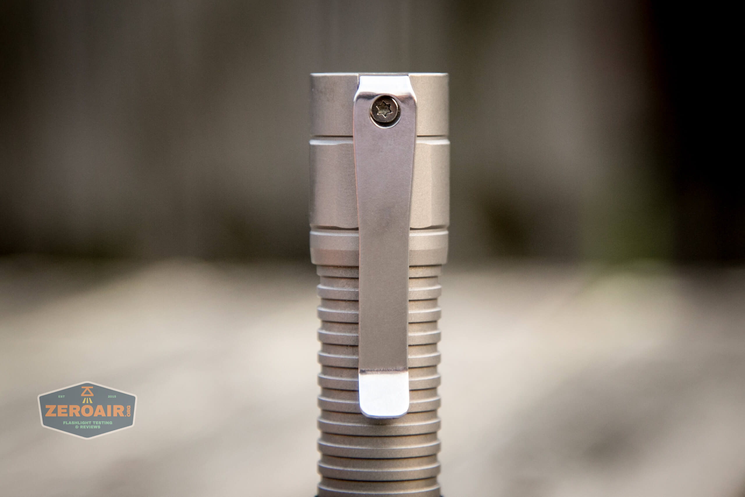 There are two main ways of carrying the Manker E05Ti Titanium flashlight. Both are seen here: the pocket clip at left, and the lanyard hole at right.