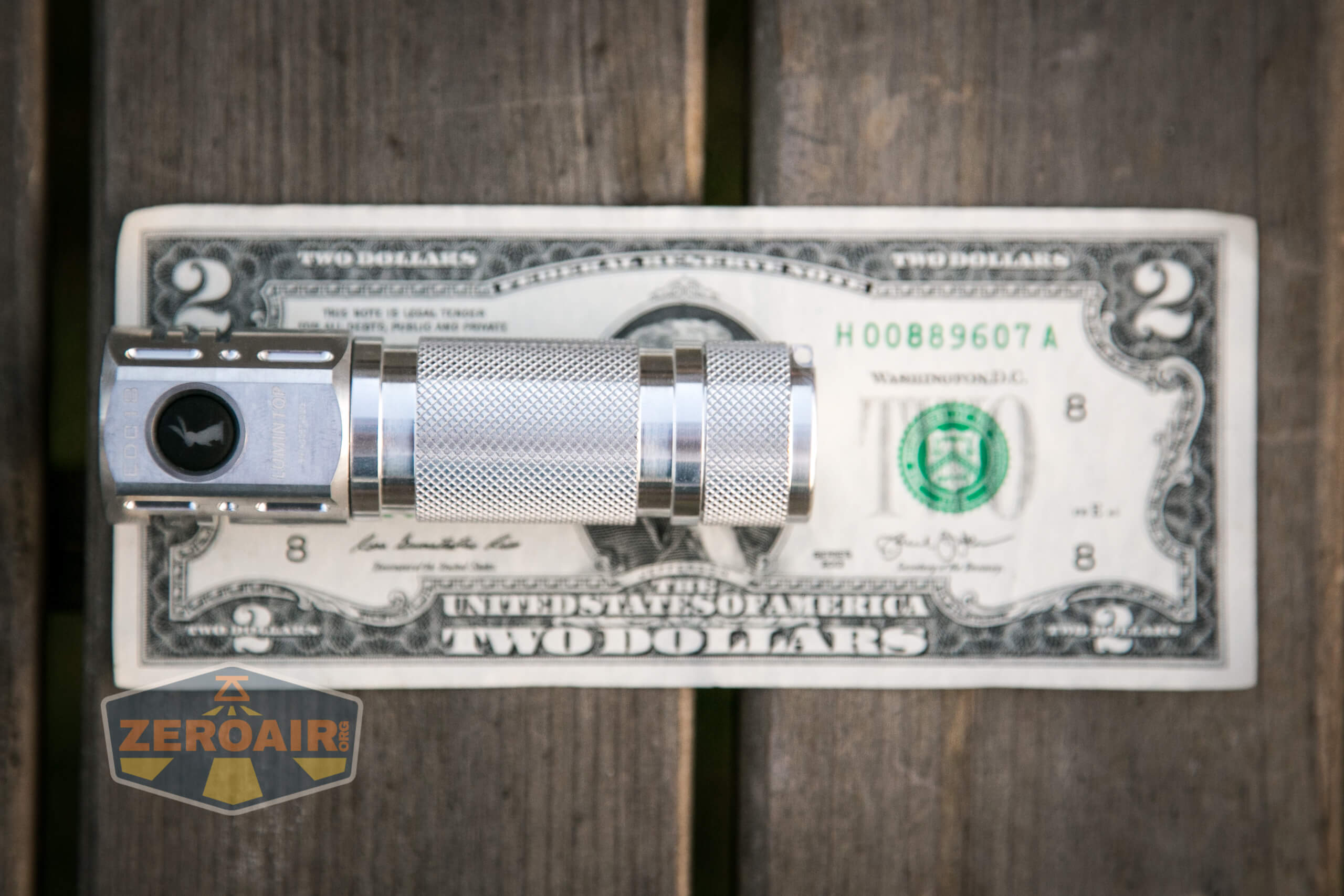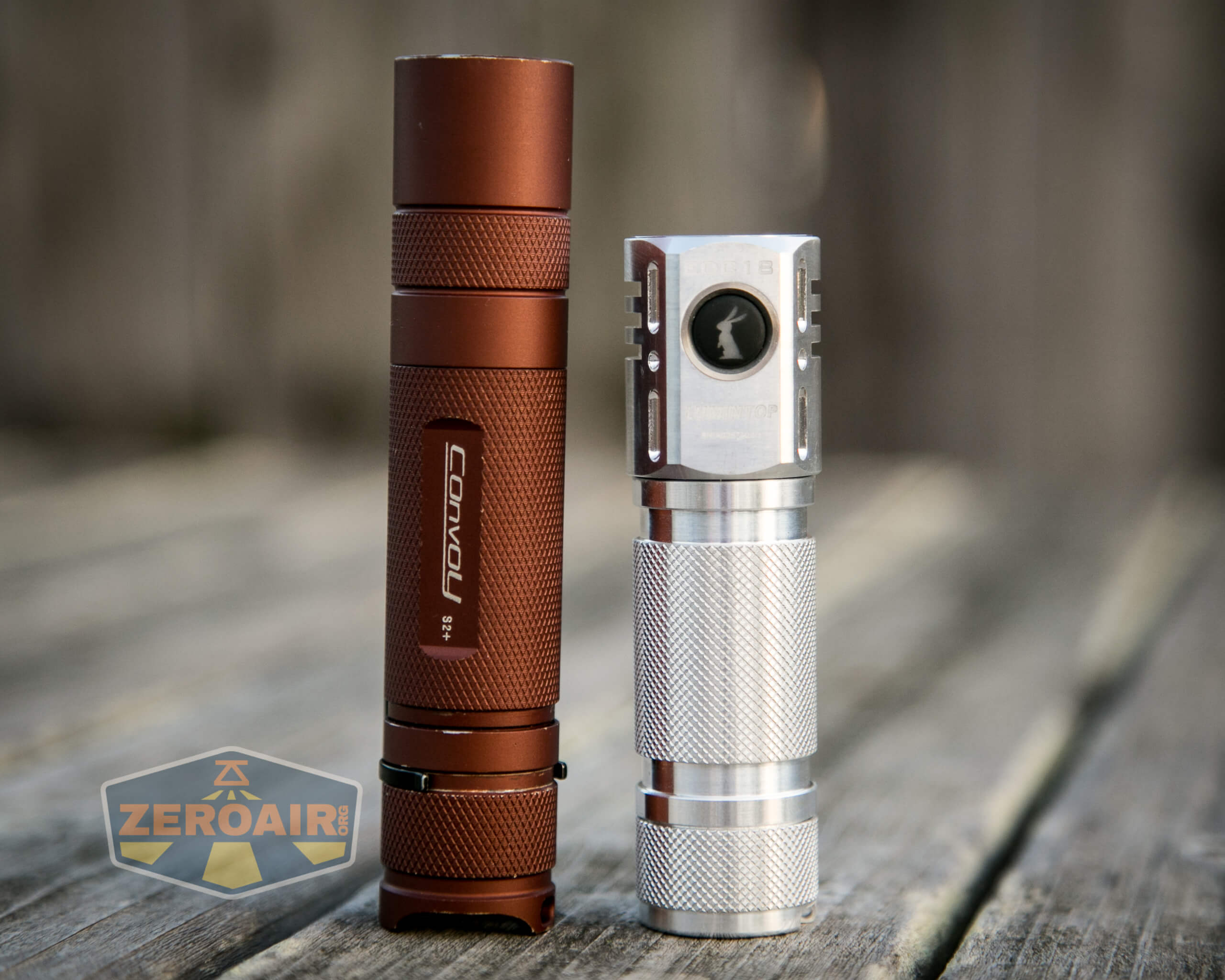 And here’s the light beside my custom-engraved TorchLAB BOSS 35, an 18350 light. I reviewed the aluminum version of that light in both 35 and 70 formats.