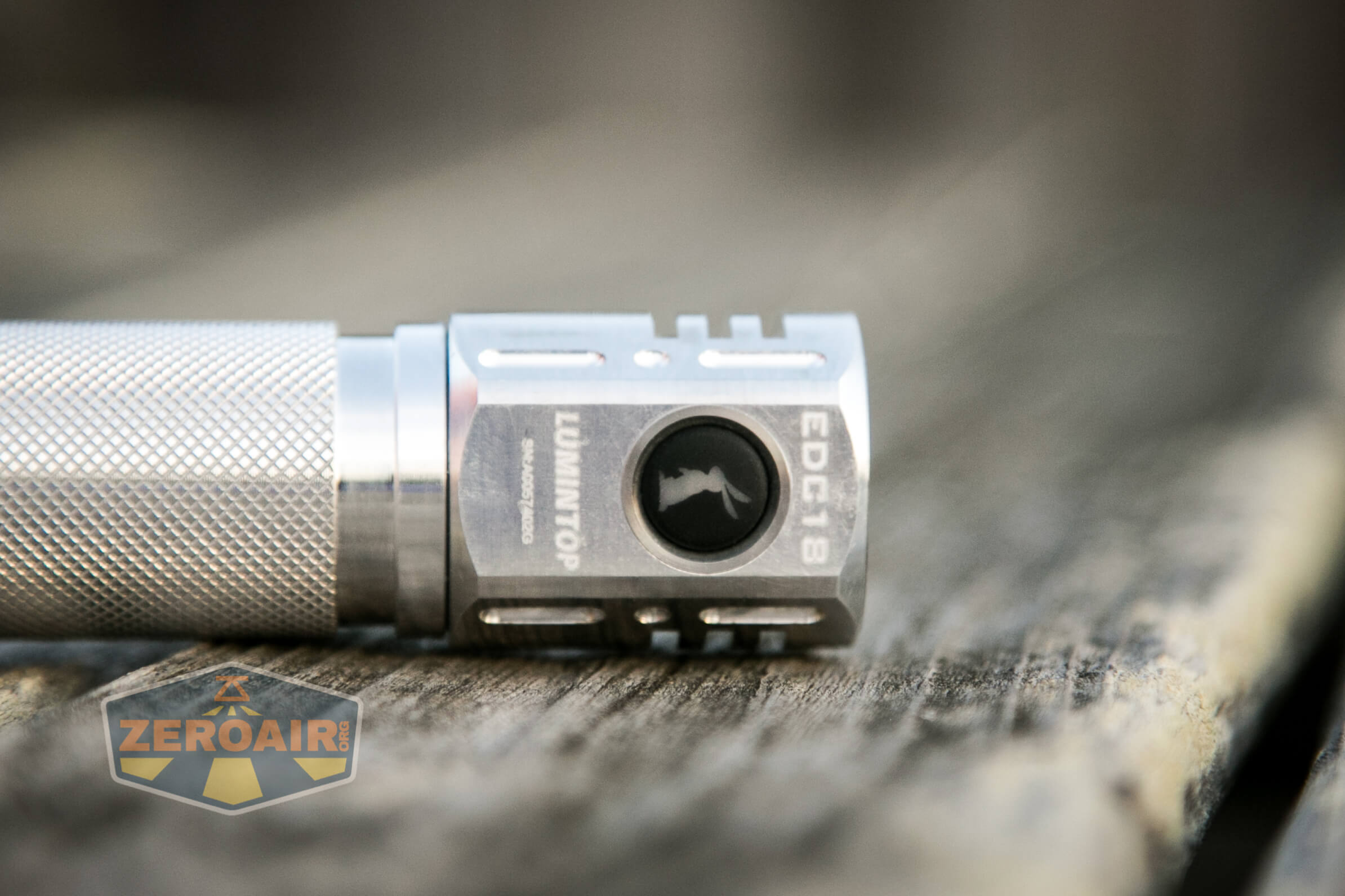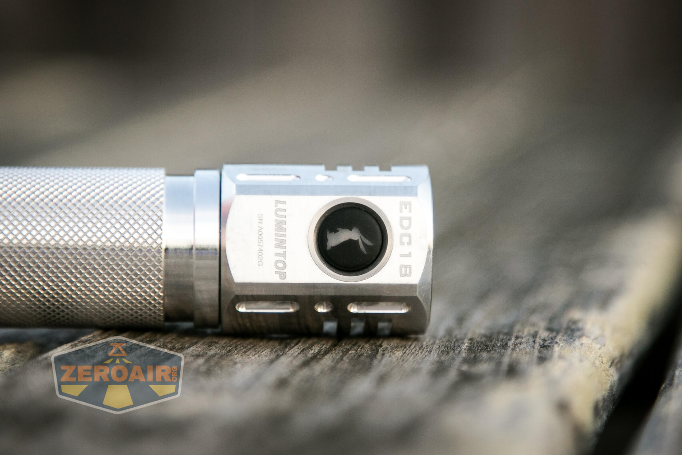 A side e-switch is used in the Lumintop EDC18 Raw flashlight. There’s a green emitter behind the switch, which is black except for a clear Lumintop logo.