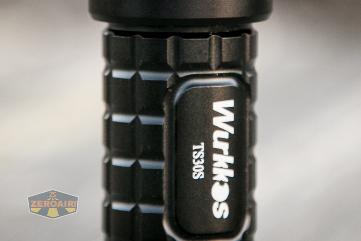 A side e-switch is used in the Wurkkos TS30S flashlight. There are two green emitters behind the switch, and the switch cover has ample knurling.