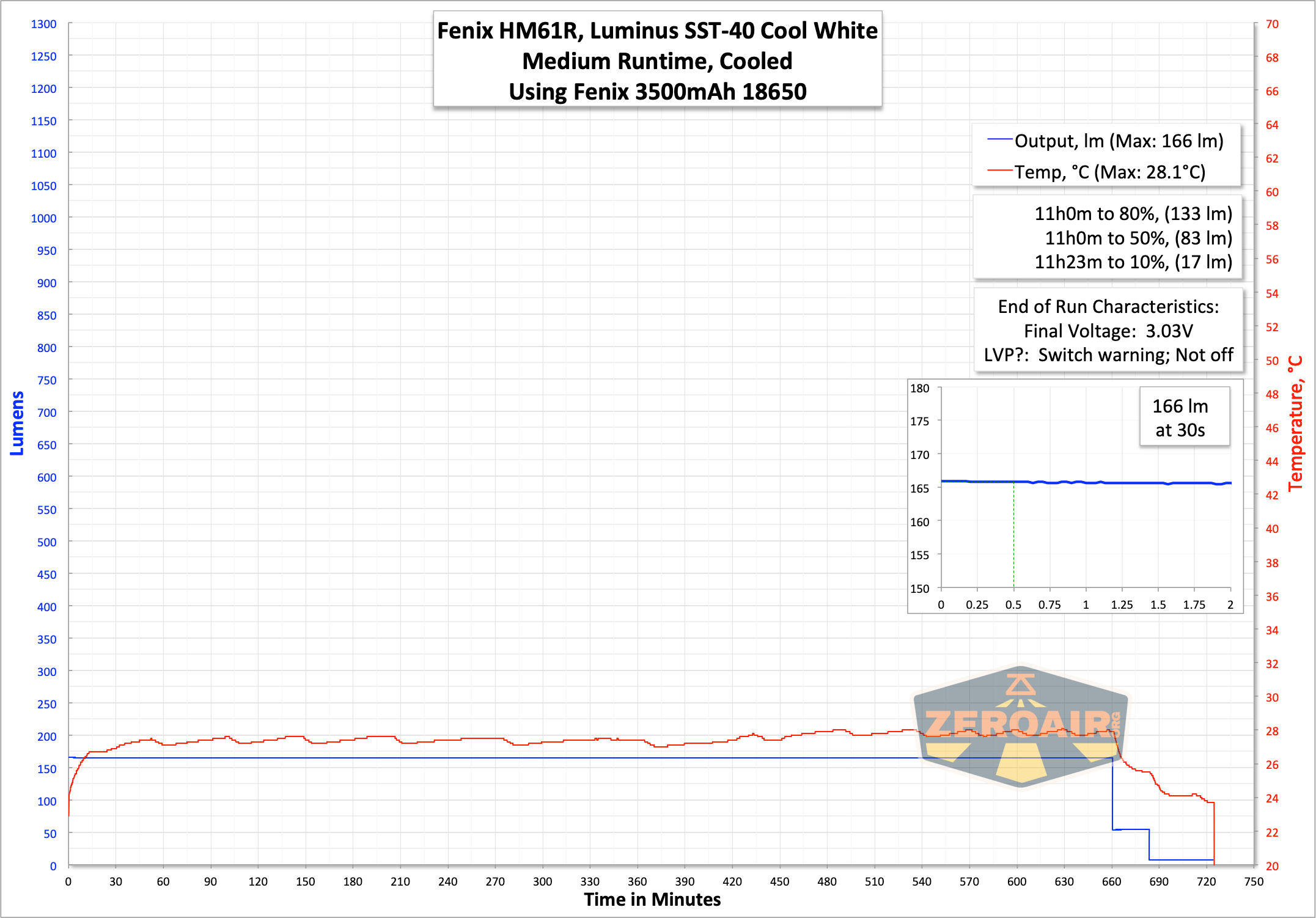 The main (white) emitter in the Fenix HM61R rechargeable headlamp is a Luminus SST-40. I can’t see where Fenix states the CCT, but based on the images below I thing we can agree it’s cool white.