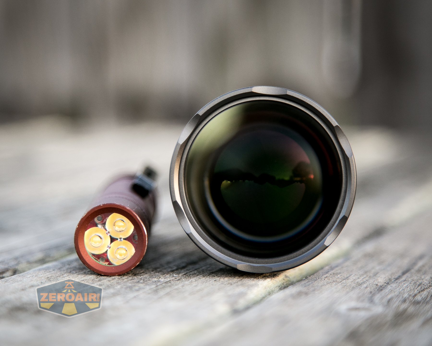 And here’s the light beside my custom-engraved TorchLAB BOSS 35, an 18350 light. I reviewed the aluminum version of that light in both 35 and 70 formats.
