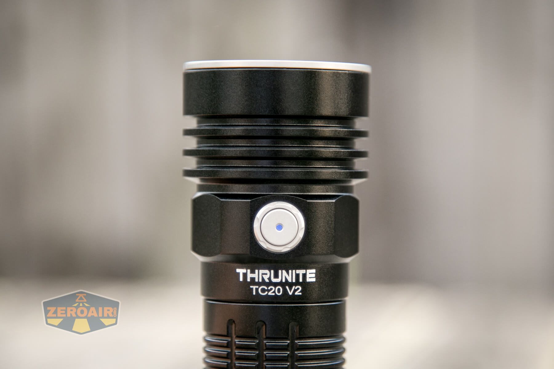 This Thrunite TC20 V2 flashlight has a single side switch, which is an indicating e-switch. As you can see, right in the center is a dot, which can display red and blue. The switch is a standard Thrunite switch. Low action, very positive click, and no squeak. It’s also metal (maaaayyyybe coated plastic, but it feels like real metal). I do find it to be loud on the click, but it’s a nice switch!