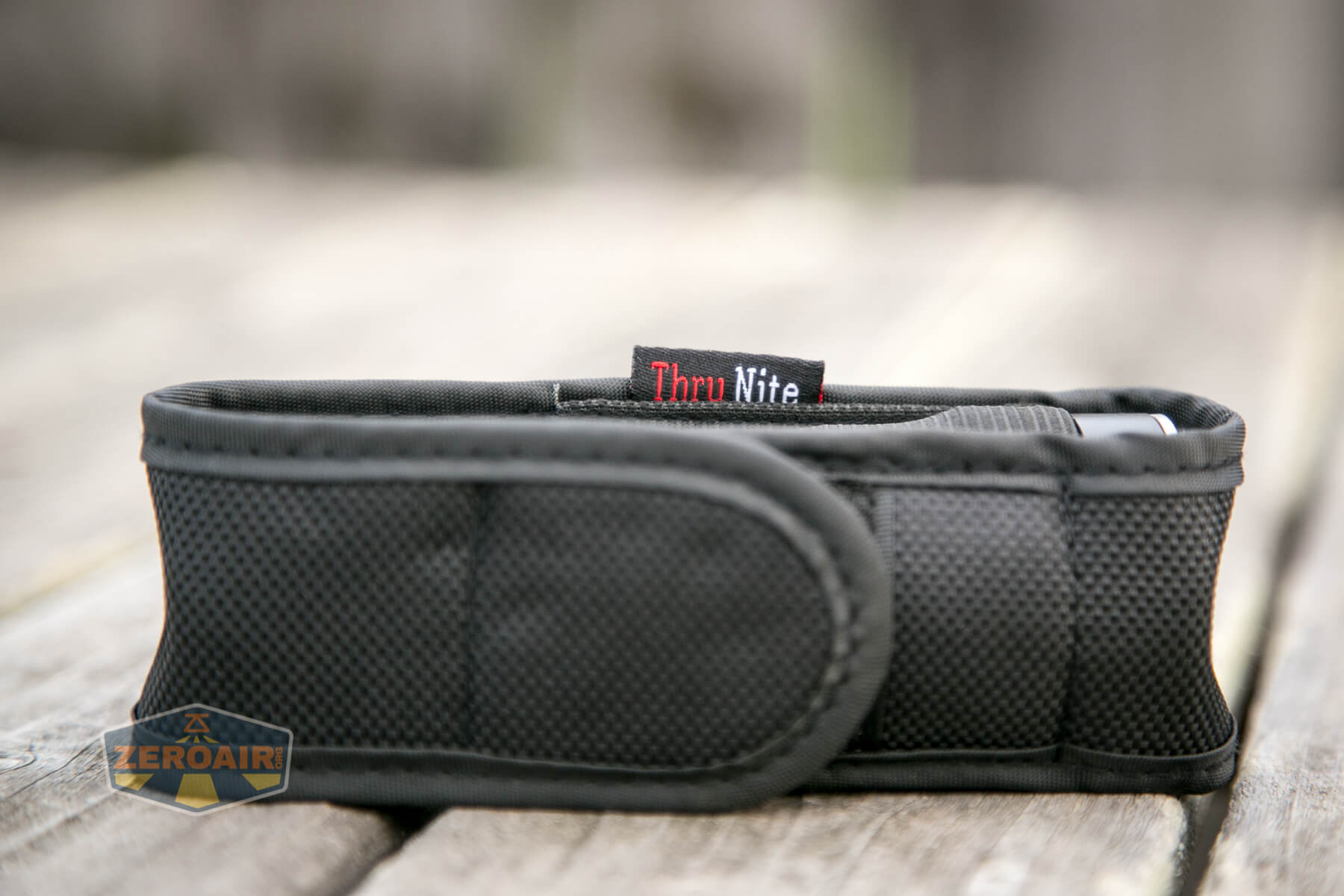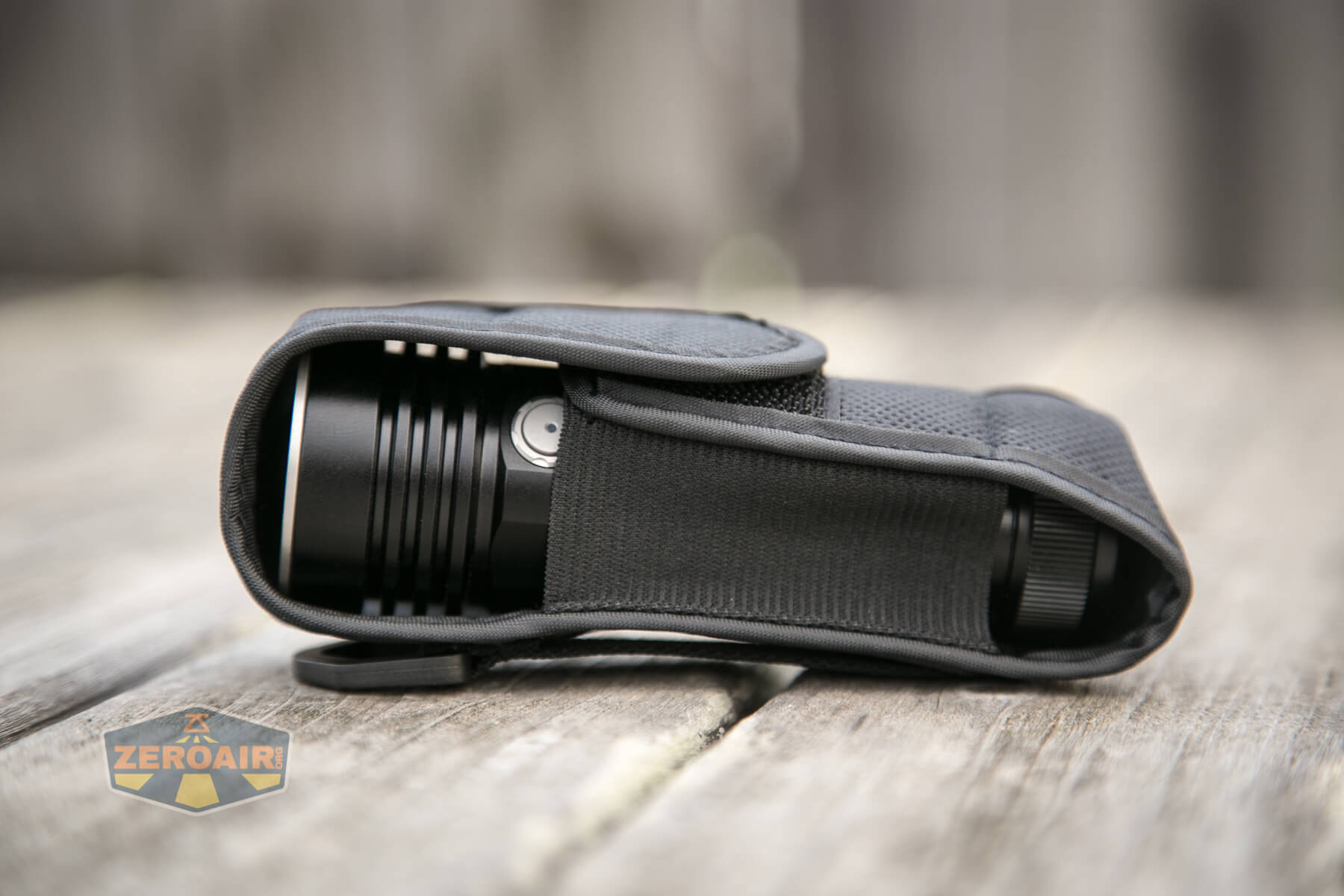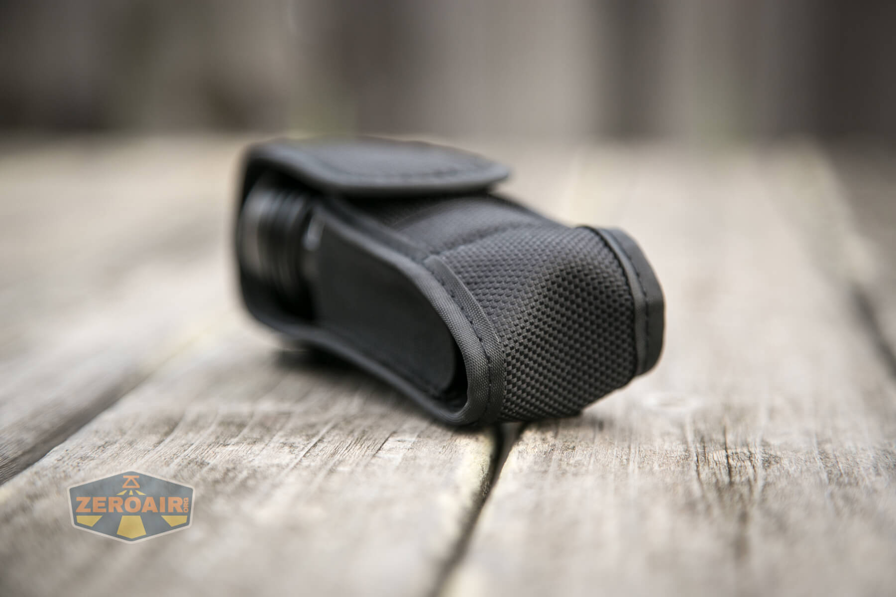 Included is a nylon belt pouch with stretchy sides. The belt loop unfortunately doesn’t have a velcro option, so must be hard-connected to the belt. The pouch holds the light in either bezel-up or down orientation.